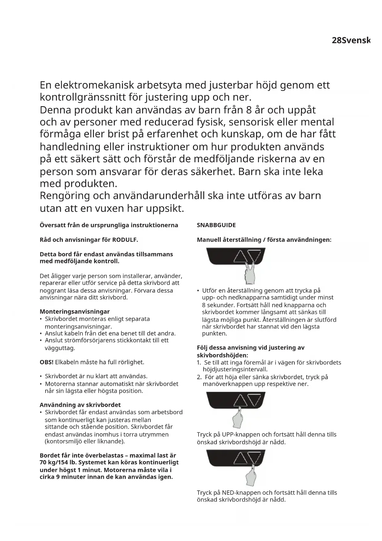 - Skrivbordet får endast användas som arbetsbord som kontinuerligt kan justeras mellan sittande och stående position. Skrivbordet får endast användas inomhus i torra utrymmen (kontorsmiljö eller liknande). Bordetfårinteöverbelastas–maximallastär 70kg/154lb.Systemetkanköraskontinuerligt underhögst1minut.Motorernamåstevilai cirka9minuterinnandekananvändasigen. SNABBGUIDE Manuellåterställning/förstaanvändningen: