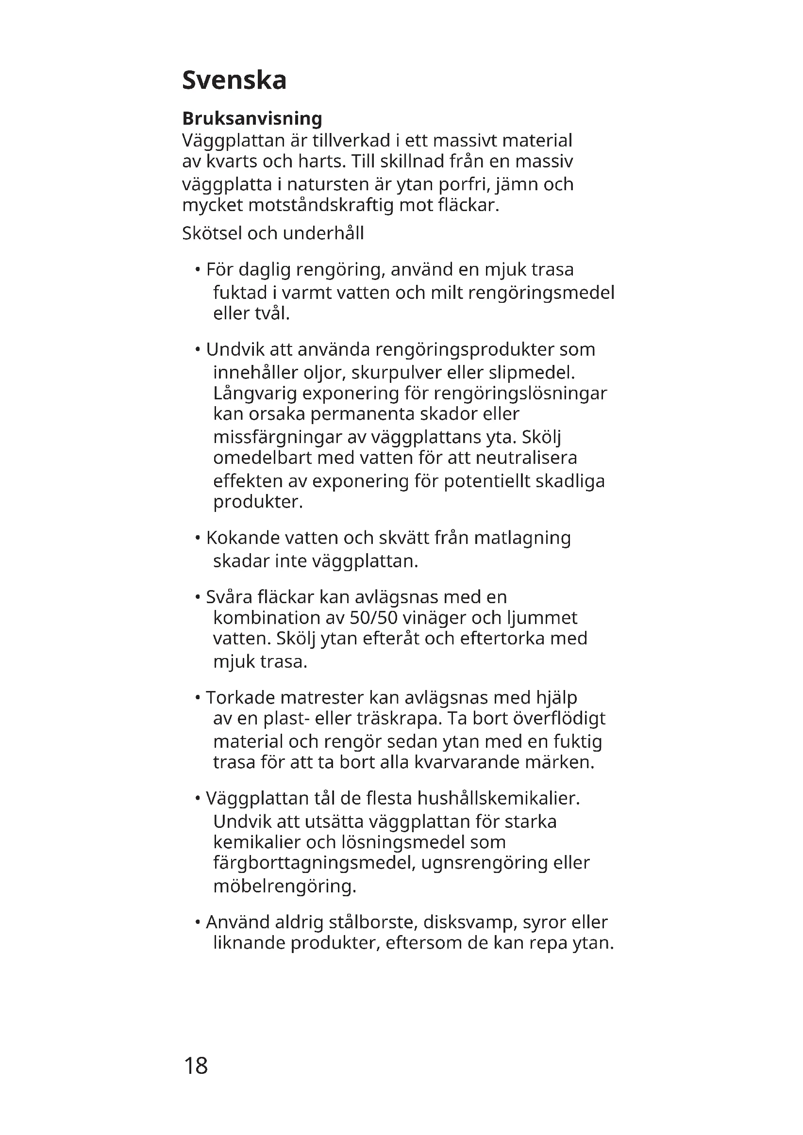 - Mattapinta vaatii enemmän puhdistamista kuin kiiltävä pinta. Metallijäämät, sormenjäljet ja muut päivittäisen elämän merkit näkyvät tässä materiaalissa, ja ne voidaan poistaa hankaamattomalla puhdistusaineella.18 Svenska Bruksanvisning Väggplattan är tillverkad i ett massivt material av kvarts och harts. Till skillnad från en massiv väggplatta i natursten är ytan porfri, jämn och mycket motståndskraftig mot äckar. Skötsel och underhåll
