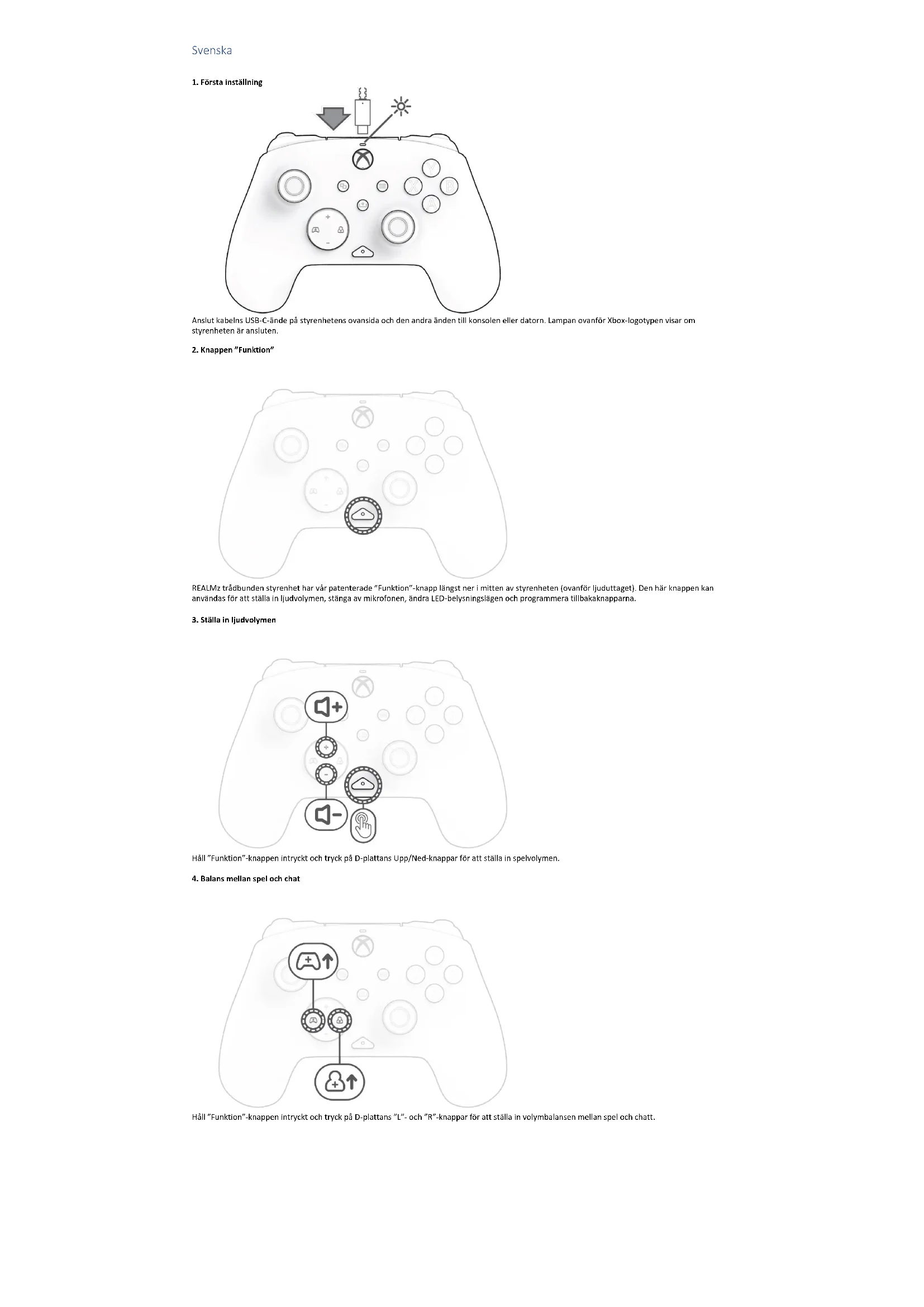 Å. REALMz trådbunden styrenhet levereras med fyra olika belysningseffekter förprogrammerade på styrenhetens A-, B-, X- och Y-knappar. Ä. För att utforska dessa effekter och bläddra igenom dem, håll ner ”Funktion”-knappen och tryck på antingen A, B, X eller Y. Obs! När styrenheten och systemet stängs av återställs belysningslägena till standardläget (läget för A-knappen).