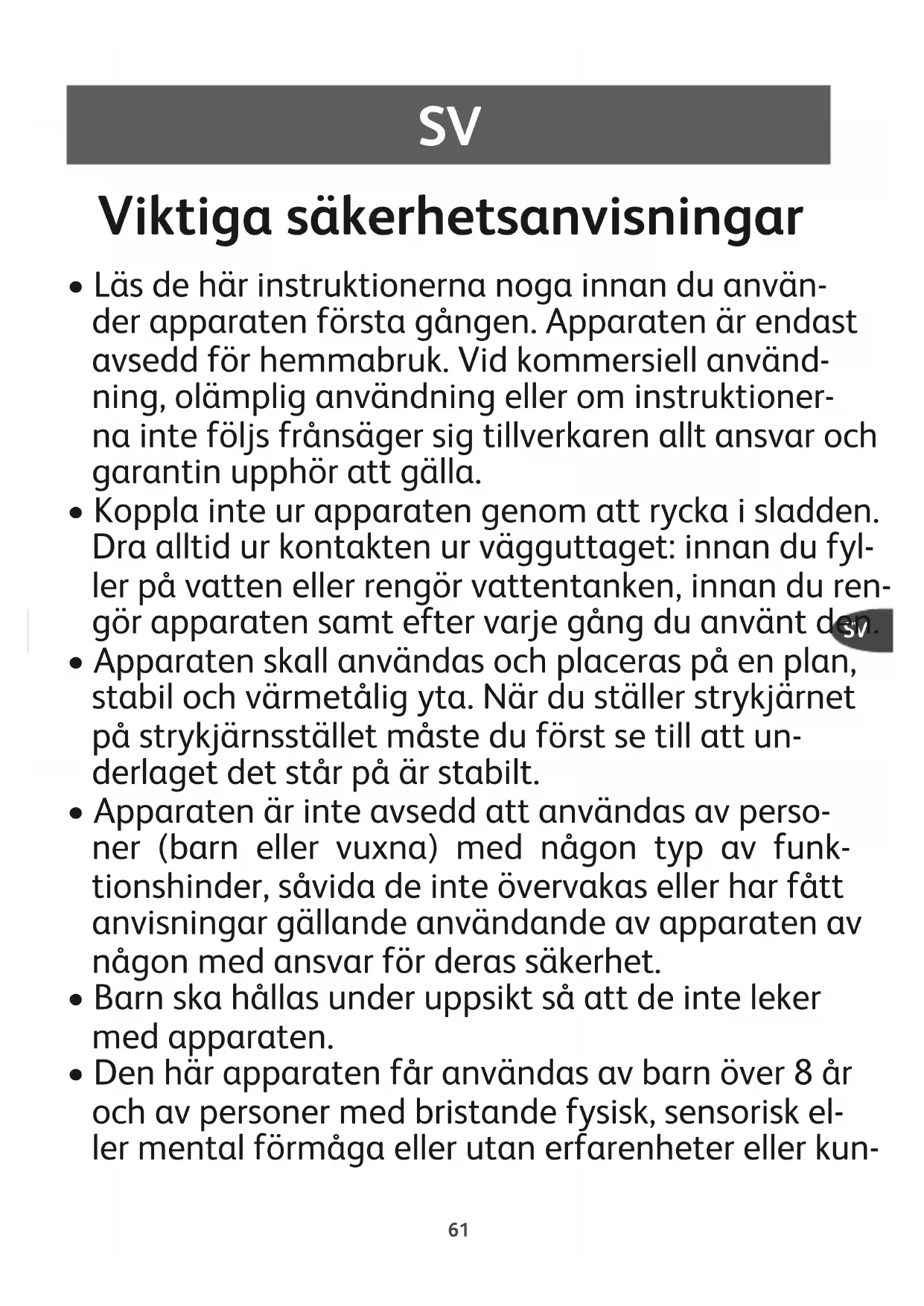 - Strykjärnet får endast användas med tillhörande stall (gäller sladdlösa strykjärn).