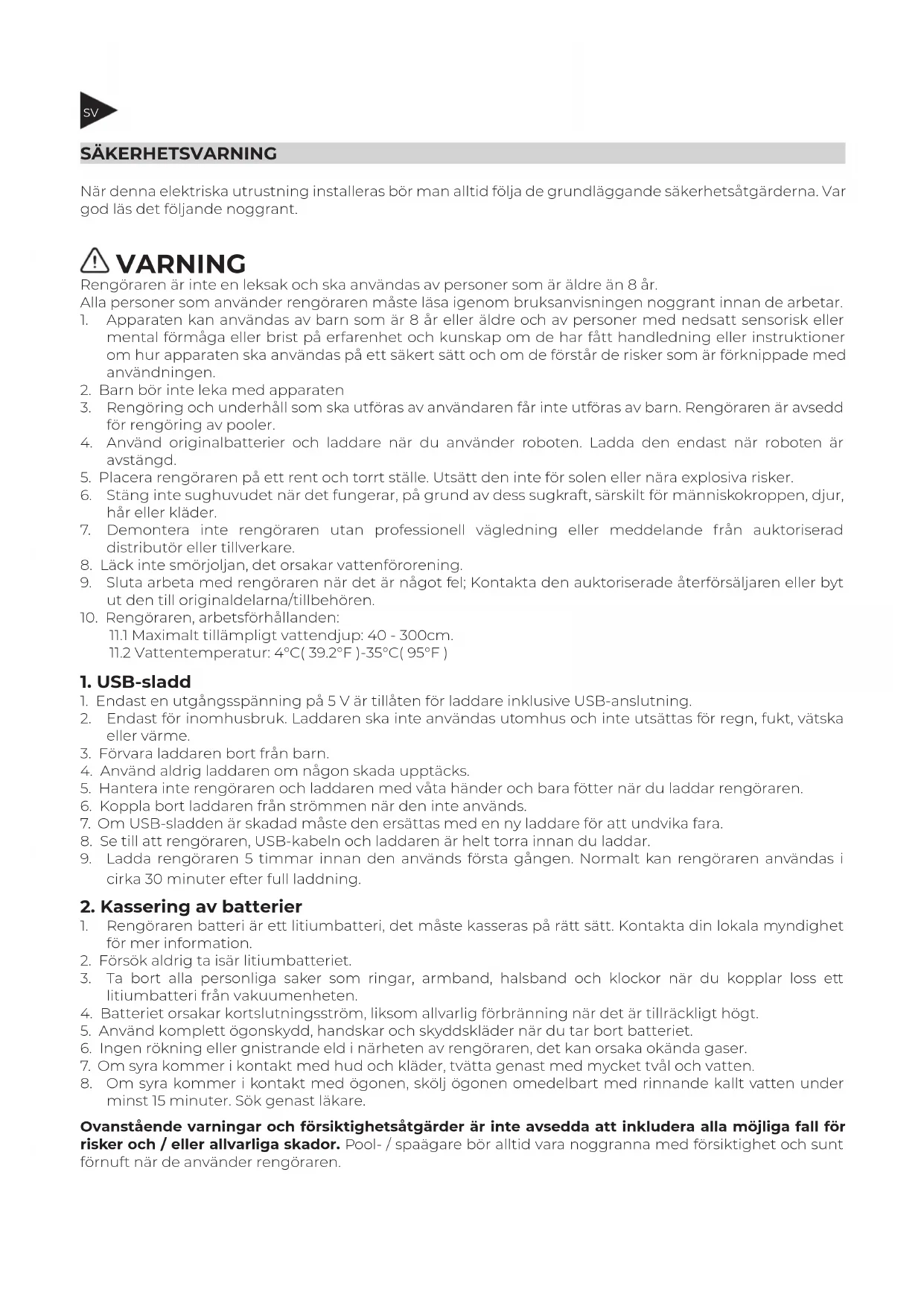 Robotar fångar inte upp skräp. Batteriet är lågt. Var god ladda Pumphjulet är täppt Stäng rengöraren och kontrollera pumphjulet för att ta bort skräpet. Om det behövs, kontakta din återförsäljare för ytterligare instruktioner. Varning! Se till att rengöraren är avstängd innan service utförs. Hjulet är skadat. Kontakta din återförsäljare för utbyte. Handskfacket är fullt. Rengör skräpet från filterskärmen. Roboten slutar att röra sig mitt i bassängen (det roterande huvudet fortsätter att rotera). Roboten stopades av ett hinder. Kontrollera om rensaren är igensatt. Ta bort hinder. Roboten är blockerad av suget från huvudavloppet i bassänggolvet. Inaktivera filtreringssystemet (se bruksanvisningen). Marken är inte helt platt Behöver du fler minuter innan du går vidare eller slätar golvet eller trimmar den nedre borstremsan. Kontakta din återförsäljare för reservdelar. Roboten kan inte täcka hela bassängen eller röra sig längs bassängens vägg. Handskfacket är fullt. Rengör skräpet från filterskärmen och filterelementet. Operationstiden var kortare än väntat. Rengör filterkammaren och ladda robotbatteriet i 4-5 timmar. Vattencirkulationen som genereras av filtreringssystemet avbryter rörelseriktningen. Inaktivera filtreringssystemet (se bruksanvisningen). Hjulet har fastnat. Kontrollera om hjulen innehåller skräp och ta bort det om så är fallet. Roboten rör sig långsamt. Handskfacket är fullt. Rengör skräpet från filterskärmen och filterelementet. Vridhuvudet roterar inte eller roterar uppenbart långsamt. Botten av svängaren har fastnat. Facket är fullt. Kontrollera om det finns skräp under det roterande huvudet och ta bort det vid behov. Den kan vridas för hand och sköljas med vatten tills den rör sig smidigt. Handskfacket är fullt. Rengör skräpet från filterskärmen och filterelementet.SV