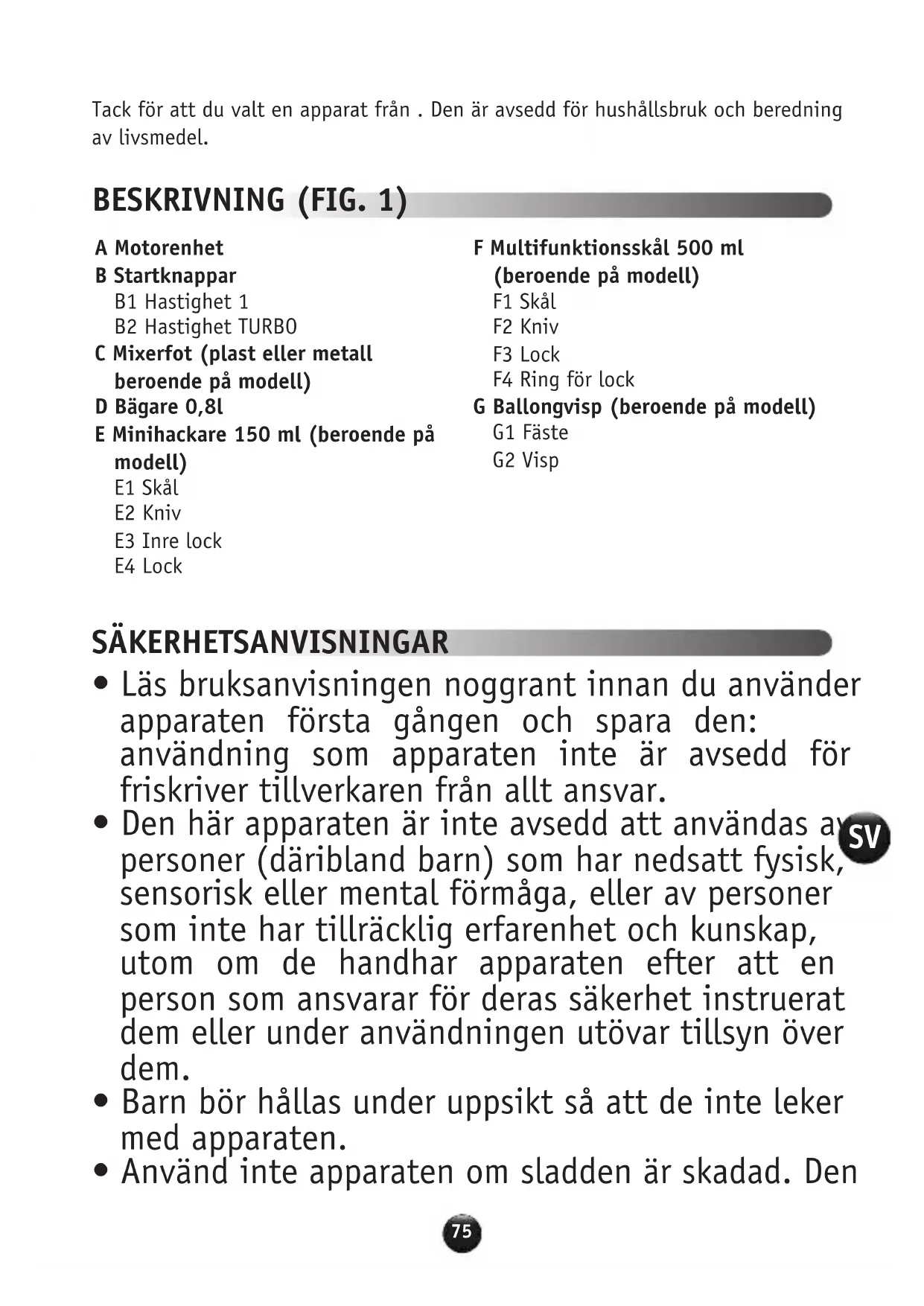 Tack för att du valt en apparat från . Den är avsedd för hushållsbruk och beredning av livsmedel. BESKRIVNING (FIG. 1) SÄKERHETSANVISNINGAR