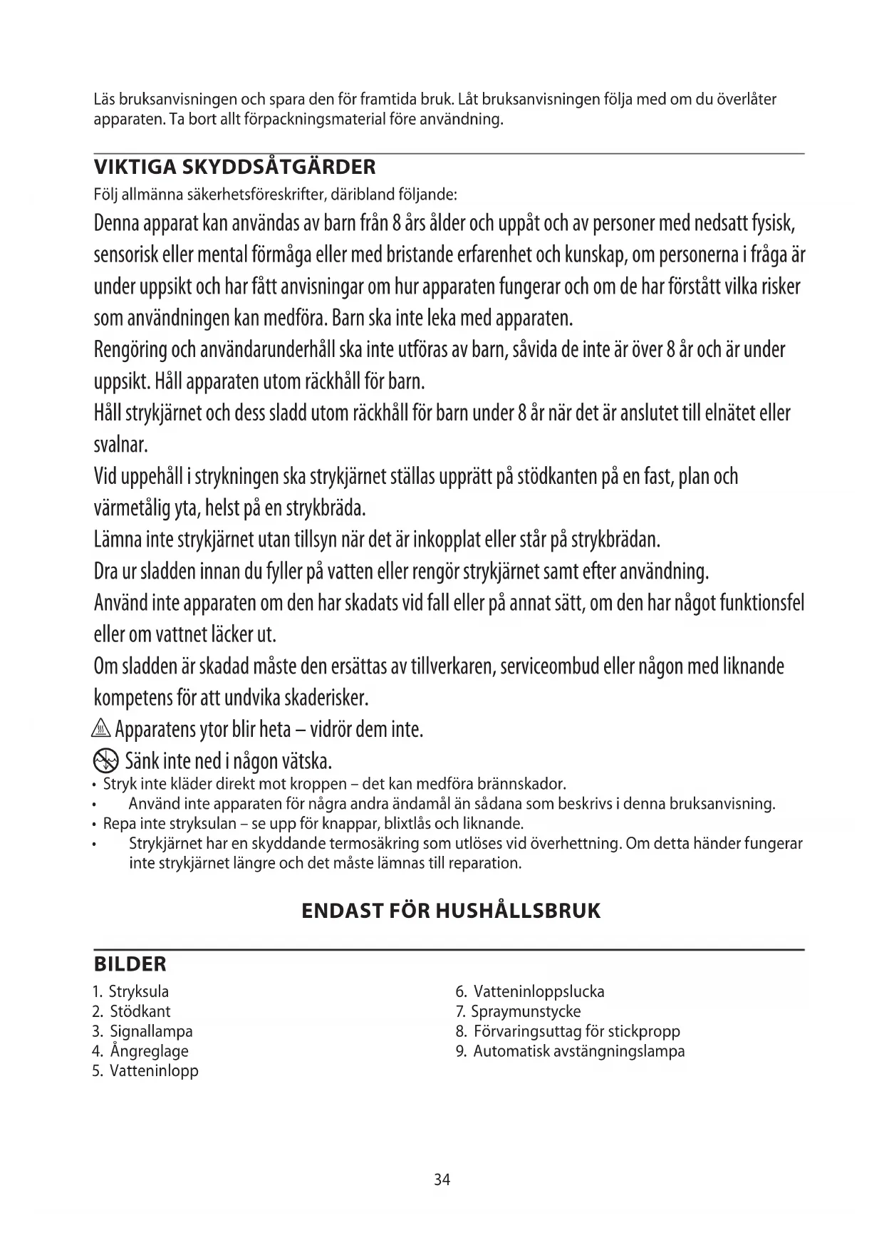 Följ allmänna säkerhetsföreskrifter, däribland följande: Denna apparat kan användas av barn från 8 års ålder och uppåt och av personer med nedsatt fysisk, sensorisk eller mental förmåga eller med bristande erfarenhet och kunskap, om personerna i fråga är under uppsikt och har fått anvisningar om hur apparaten fungerar och om de har förstått vilka risker som användningen kan medföra. Barn ska inte leka med apparaten. Rengöring och användarunderhåll ska inte utföras av barn, såvida de inte är över 8 år och är under uppsikt. Håll apparaten utom räckhåll för barn. Håll strykjärnet och dess sladd utom räckhåll för barn under 8 år när det är anslutet till elnätet eller svalnar. Vid uppehåll i strykningen ska strykjärnet ställas upprätt på stödkanten på en fast, plan och värmetålig yta, helst på en strykbräda. Lämna inte strykjärnet utan tillsyn när det är inkopplat eller står på strykbrädan. Dra ur sladden innan du fyller på vatten eller rengör strykjärnet samt efter användning. Använd inte apparaten om den har skadats vid fall eller på annat sätt, om den har något funktionsfel eller om vattnet läcker ut. Om sladden är skadad måste den ersättas av tillverkaren, serviceombud eller någon med liknande kompetens för att undvika skaderisker. h Apparatens ytor blir heta – vidrör dem inte.