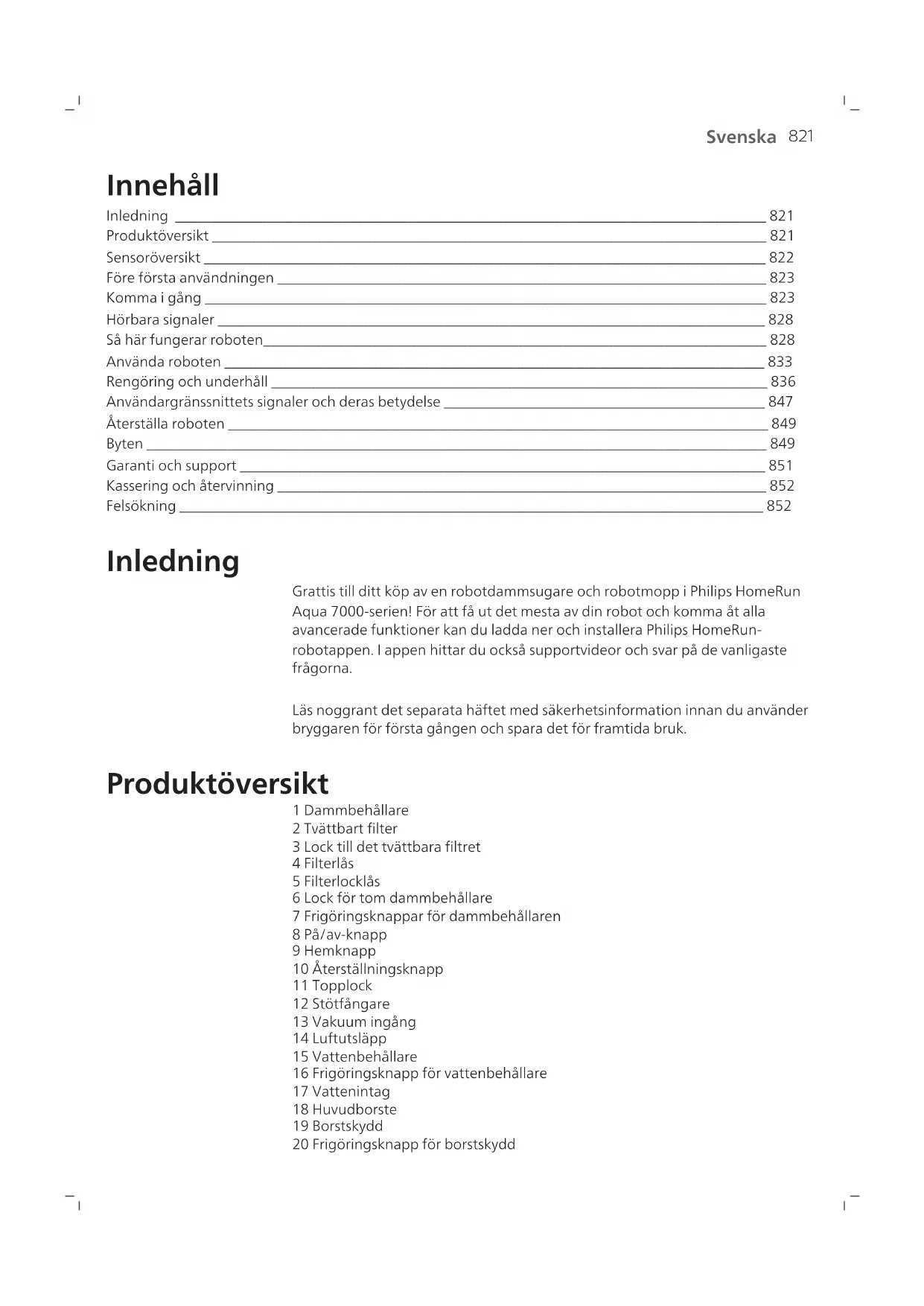 Svenska Innehåll Inledning _________________________________________________________________________________ 821 Produktöversikt ____________________________________________________________________________ 821 Sensoröversikt _____________________________________________________________________________ 822 Före första användningen ___________________________________________________________________ 823 Komma i gång _____________________________________________________________________________ 823 Hörbara signaler ___________________________________________________________________________ 828 Så här fungerar roboten_____________________________________________________________________ 828 Använda roboten __________________________________________________________________________ 833 Rengöring och underhåll ____________________________________________________________________ 836 Användargränssnittets signaler och deras betydelse ____________________________________________ 847 Återställa roboten __________________________________________________________________________ 849 Byten _____________________________________________________________________________________ 849 Garanti och support ________________________________________________________________________ 851 Kassering och återvinning ___________________________________________________________________ 852 Felsökning ________________________________________________________________________________ 852 Inledning Grattis till ditt köp av en robotdammsugare och robotmopp i Philips HomeRun Aqua 7000-serien! För att få ut det mesta av din robot och komma åt alla avancerade funktioner kan du ladda ner och installera Philips HomeRun- robotappen. I appen hittar du också supportvideor och svar på de vanligaste frågorna. Läs noggrant det separata häftet med säkerhetsinformation innan du använder bryggaren för första gången och spara det för framtida bruk. Produktöversikt 1 Dammbehållare 2 Tvättbart filter 3 Lock till det tvättbara filtret 4 Filterlås 5 Filterlocklås 6 Lock för tom dammbehållare 7 Frigöringsknappar för dammbehållaren 8 På/av-knapp 9 Hemknapp 10 Återställningsknapp 11 Topplock 12 Stötfångare 13 Vakuum ingång 14 Luftutsläpp 15 Vattenbehållare 16 Frigöringsknapp för vattenbehållare 17 Vattenintag 18 Huvudborste 19 Borstskydd 20 Frigöringsknapp för borstskydd822 Svenska 21 Huvudhjul 22 Främre svängbart hjul 23 Laddkontakter (robot) 24 Sidoborste 25 Moppmunstycke 26 Tvättbar moppdyna (2x) 27 Nätkabel (XU7000) 28 (Laddnings)station (XU7000) 29 IR-signalfönster (XU7000) 30 Laddkontakter (station) 31 Nätkabel uttag 32 Mopptillsats (XU7000) 33 Dammpåse (2x) (XU7100) 34 Lock till behållare 35 Fack för dammpåse 36 Station för automatisk tömning (XU7100) 37 Indikatorlampa 38 IR-signalfönster 39 Ramp 40 Ingång för automatisk tömning 41 Luftutsläpp för automatisk tömning 42 Laddkontakter (station) 43 Utloppsventilation 44 Borstrengöringsverktyg 45 Nätkabel uttag 46 Nätkabel (XU7100) Sensoröversikt