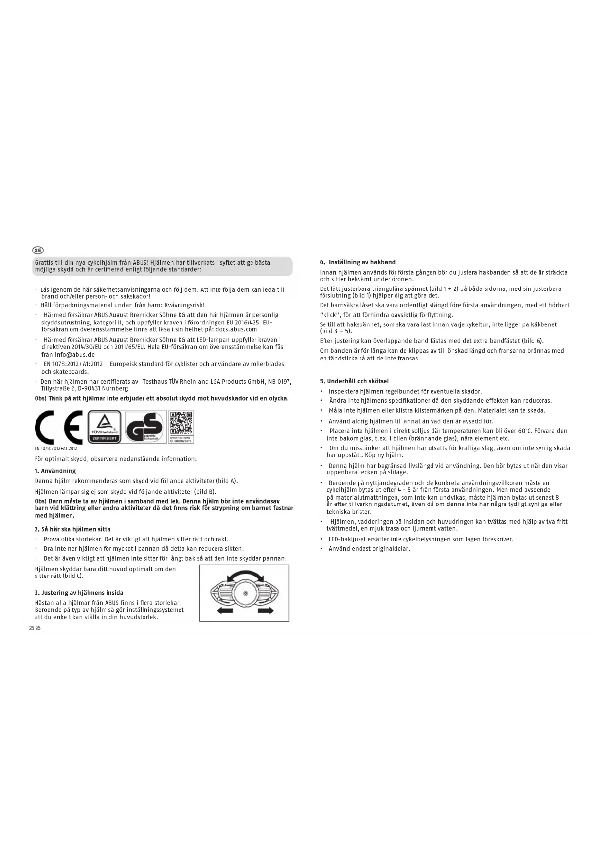 - Härmed försäkrar ABUS August Bremicker Söhne KG att den här hjälmen är personlig skyddsutrustning, kategori II, och uppfyller kraven i förordningen EU 2016/425. EU- försäkran om överensstämmelse finns att läsa i sin helhet på: docs.abus.com