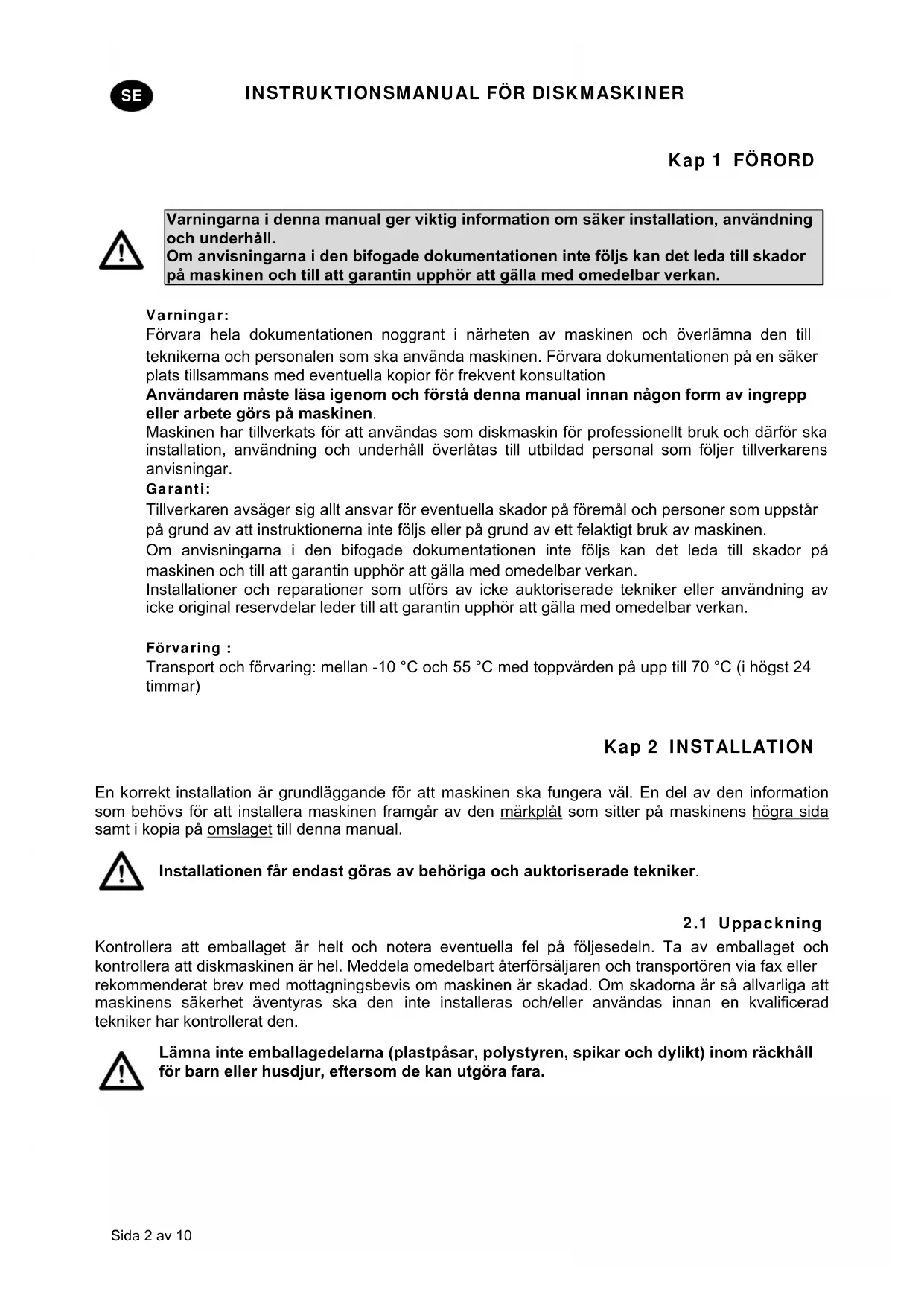 KAP 8 AVFALLSHANTERING .............................................................................................. 10 KAP 9 MILJÖ ......................................................................................................................... 10 Tillverkaren förbehåller sig, i enlighet med gällande lagar, rätten till detta dokument och förbjuder alla former av återgivning och spridning utan skriftligt tillstånd. Tillverkaren förbehåller sig rätten att utföra eventuella ändringar för att utföra de förbättringar som anses nödvändiga utan att meddela detta på förhand. 442480 M OEM REV00 24-01-2017 U SEINSTRUKTIONSMANUAL FÖR DISKMASKINER Sida 2 av 10