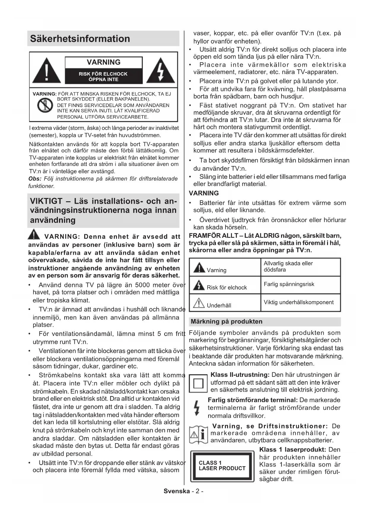 - Mer information Svenska - 2 - Säkerhetsinformation VARNING RISK FÖR ELCHOCKÖPPNA INTEVARNING: FÖR ATT MINSKA RISKEN FÖR ELCHOCK, TA EJ BORT SKYDDET (ELLER BAKPANELEN). DET FINNS SERVICEDELAR SOM ANVÄNDAREN INTE KAN SERVA INUTI. LÅT KVALIFICERAD PERSONAL UTFÖRA SERVICEARBETE.Obs: Följ instruktionerna på skärmen för driftsrelaterade funktioner.I extrema väder (storm, åska) och långa perioder av inaktivitet (semester), koppla ur TV-setet från huvudströmmen.Nätkontakten används för att koppla bort TV-apparaten från elnätet och därför måste den förbli lättåtkomlig. Om TV-apparaten inte kopplas ur elektriskt från elnätet kommer enheten fortfarande att dra ström i alla situationer även om TV:n är i vänteläge eller avstängd. VIKTIGT – Läs installations- och an- vändningsinstruktionerna noga innan användning VARNING: Denna enhet är avsedd att användas av personer (inklusive barn) som är kapabla/erfarna av att använda sådan enhet oövervakade, såvida de inte har fått tillsyn eller instruktioner angående användning av enheten av en person som är ansvarig för deras säkerhet. Använd denna TV på lägre än 5000 meter över havet, på torra platser och i områden med måttliga eller tropiska klimat. TV:n är ämnad att användas i hushåll och liknande innemiljö, men kan även användas på allmänna platser. För ventilationsändamål, lämna minst 5 cm fritt utrymme runt TV:n. Ventilationen får inte blockeras genom att täcka över eller blockera ventilationsöppningarna med föremål såsom tidningar, dukar, gardiner etc. Strömkabelns kontakt ska vara lätt att komma åt. Placera inte TV:n eller möbler och dylikt på strömkabeln. En skadad nätsladd/kontakt kan orsaka brand eller en elektrisk stöt. Dra alltid ur kontakten vid fästet, dra inte ur genom att dra i sladden. Ta aldrig tag i nätsladden/kontakten med våta händer eftersom det kan leda till kortslutning eller elstötar. Slå aldrig knut på strömkabeln och knyt inte samman den med andra sladdar. Om nätsladden eller kontakten är skadad måste den bytas ut. Detta får endast göras av utbildad personal. Utsätt inte TV:n för droppande eller stänk av vätskor och placera inte föremål fyllda med vätska, såsom vaser, koppar, etc. på eller ovanför TV:n (t.ex. på hyllor ovanför enheten). Utsätt aldrig TV:n för direkt solljus och placera inte öppen eld som tända ljus på eller nära TV:n. Placera inte värmekällor som elektriska värmeelement, radiatorer, etc. nära TV-apparaten. Placera inte TV:n på golvet eller på lutande ytor. För att undvika fara för kvävning, håll plastpåsarna borta från spädbarn, barn och husdjur. Fäst stativet noggrant på TV:n. Om stativet har medföljande skruvar, dra åt skruvarna ordentligt för att förhindra att TV:n lutar. Dra inte åt skruvarna för hårt och montera stativgummit ordentligt. Placera inte TV där den kommer att utsättas för direkt solljus eller andra starka ljuskällor eftersom detta kommer att resultera i bildskärmsdefekter. p. 13