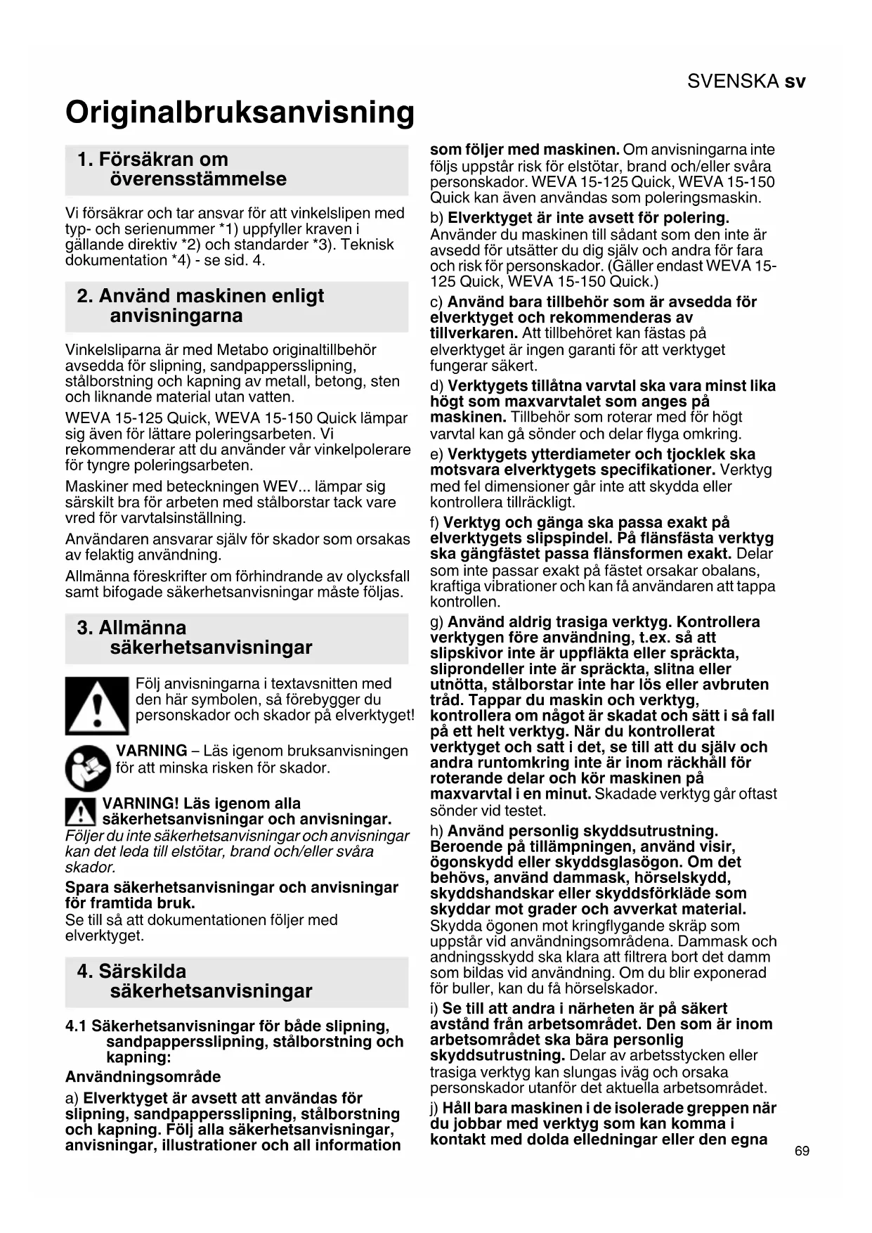 Originalbruksanvisning Vi försäkrar och tar ansvar för att vinkelslipen med typ- och serienummer *1) uppfyller kraven i gällande direktiv *2) och standarder *3). Teknisk dokumentation *4) - se sid. 4. Vinkelsliparna är med Metabo originaltillbehör avsedda för slipning, sandpappersslipning, stålborstning och kapning av metall, betong, sten och liknande material utan vatten. WEVA 15-125 Quick, WEVA 15-150 Quick lämpar sig även för lättare poleringsarbeten. Vi rekommenderar att du använder vår vinkelpolerare för tyngre poleringsarbeten. Maskiner med beteckningen WEV... lämpar sig särskilt bra för arbeten med stålborstar tack vare vred för varvtalsinställning. Användaren ansvarar själv för skador som orsakas av felaktig användning. Allmänna föreskrifter om förhindrande av olycksfall samt bifogade säkerhetsanvisningar måste följas. Följ anvisningarna i textavsnitten med den här symbolen, så förebygger du personskador och skador på elverktyget! VARNING – Läs igenom bruksanvisningen för att minska risken för skador. VARNING! Läs igenom alla säkerhetsanvisningar och anvisningar. Följer du inte säkerhetsanvisningar och anvisningar kan det leda till elstötar, brand och/eller svåra skador. Spara säkerhetsanvisningar och anvisningar för framtida bruk. Se till så att dokumentationen följer med elverktyget.