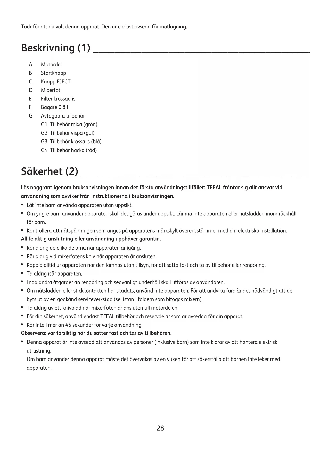 Tack för att du valt denna apparat. Den är endast avsedd för matlagning. Beskrivning (1) _______________________________________________ Motordel Startknapp Knapp EJECT Mixerfot Filter krossad is Bägare 0,8 l Avtagbara tillbehör G1 Tillbehör mixa (grön) G2 Tillbehör vispa (gul) G3 Tillbehör krossa is (blå) G4 Tillbehör hacka (röd) Säkerhet (2) __________________________________________________ Läs noggrant igenom bruksanvisningen innan det första användningstillfället: TEFAL fråntar sig allt ansvar vid användning som avviker från instruktionerna i bruksanvisningen. Låt inte barn använda apparaten utan uppsikt. Om yngre barn använder apparaten skall det göras under uppsikt. Lämna inte apparaten eller nätsladden inom räckhåll för barn. Kontrollera att nätspänningen som anges på apparatens märkskylt överensstämmer med din elektriska installation. All felaktig anslutning eller användning upphäver garantin. Rör aldrig de olika delarna när apparaten är igång. Rör aldrig vid mixerfotens kniv när apparaten är ansluten. Koppla alltid ur apparaten när den lämnas utan tillsyn, för att sätta fast och ta av tillbehör eller rengöring. Ta aldrig isär apparaten. Inga andra åtgärder än rengöring och sedvanligt underhåll skall utföras av användaren. Om nätsladden eller stickkontakten har skadats, använd inte apparaten. För att undvika fara är det nödvändigt att de byts ut av en godkänd serviceverkstad (se listan i foldern som bifogas mixern). Ta aldrig av ett knivblad när mixerfoten är ansluten till motordelen. För din säkerhet, använd endast TEFAL tillbehör och reservdelar som är avsedda för din apparat. Kör inte i mer än 45 sekunder för varje användning. Observera: var försiktig när du sätter fast och tar av tillbehören. Denna apparat är inte avsedd att användas av personer (inklusive barn) som inte klarar av att hantera elektrisk utrustning. Om barn använder denna apparat måste det övervakas av en vuxen för att säkerställa att barnen inte leker med apparaten.