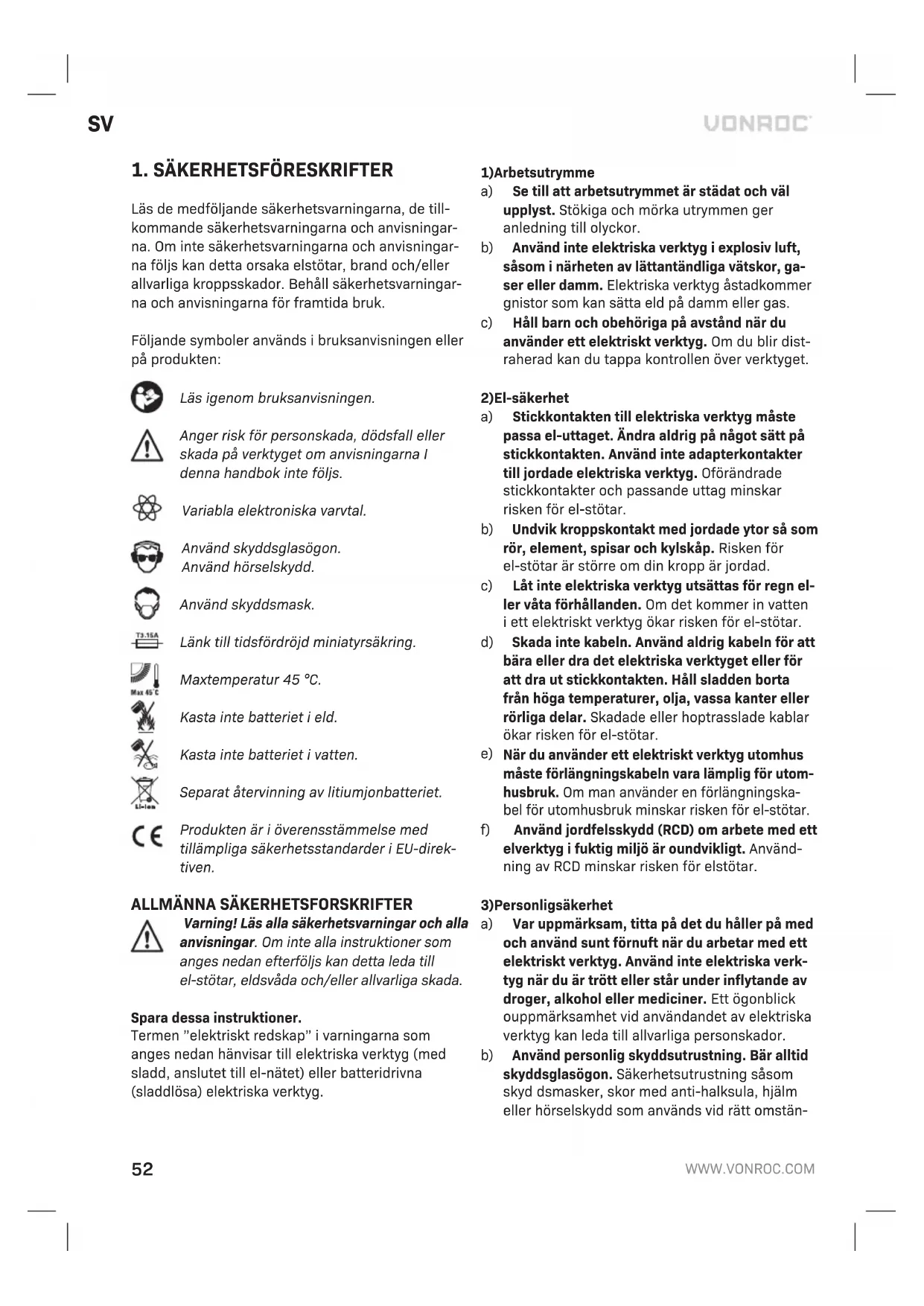 Stäng alltid av maskinen och ta ut batteripaketet från maskinen innan underhåll. Rengör maskinen hus regelbundet med en mjuk trasa, helst efter varje gång du använder maskinen. Se till att ventilationsöppningarna är fria från damm och smuts. Ta bort mycket ihållande smuts med en mjuk trasa fuktad med tvållösning. Använd inte lösningsmedel som bensin, alkohol, ammoniak osv. Sådana kemikalier skadar de syntetiska kompo- nenterna. MILJÖ Felaktig och/eller kasserad elektrisk eller elektronisk utrustning måste lämnas in på lämpliga återvinningsstationer. Endast för EU-länder Släng inte elverktyg i hushållsavfallet. Enligt det europeiska WEEE-direktivet 2012/19/EU för avfall från elektrisk och elektronisk utrustning och dess tillämpning nationellt ska elverktyg som inte längre kan användas samlas in separat och kasseras på ett miljövänligt sätt. GARANTI VONROC produkter är utvecklade enligt högsta kva- litetsstandard och garanteras vara utan defekter både vad gäller material och tillverkning under den period som stipuleras enligt lag med början från ursprungligt inköpsdatum. Om något fel uppstår på produkten under denna period på grund av material- och/eller tillverkningsfel skall VONROC kontaktas direkt. Följande omständigheter exkluderas från denna garanti: