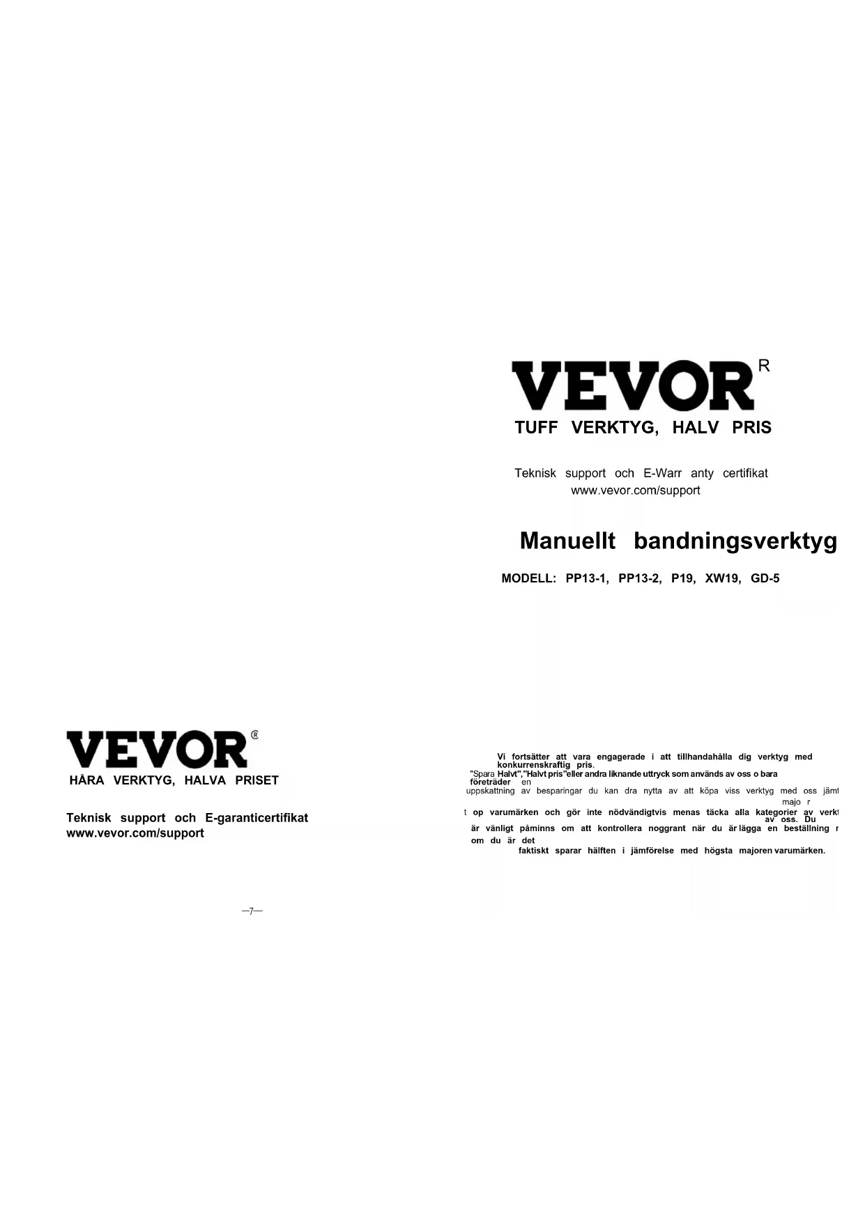 Teknisk support och E-Warr anty certifikat www.vevor.com/support Manuellt bandningsverktyg MODELL: PP13-1, PP13-2, P19, XW19, GD-5 Vi fortsätter att vara engagerade i att tillhandahålla dig verktyg med konkurrenskraftig pris. "Spara Halvt","Halvt pris"eller andra liknande uttryck som används av oss o bara företräder en uppskattning av besparingar du kan dra nytta av att köpa viss verktyg med oss jämfört till de majo r t op varumärken och gör inte nödvändigtvis menas täcka alla kategorier av verktyg erbjuds av oss. Du är vänligt påminns om att kontrollera noggrant när du är lägga en beställning med oss om du är det faktiskt sparar hälften i jämförelse med högsta majoren varumärken.—