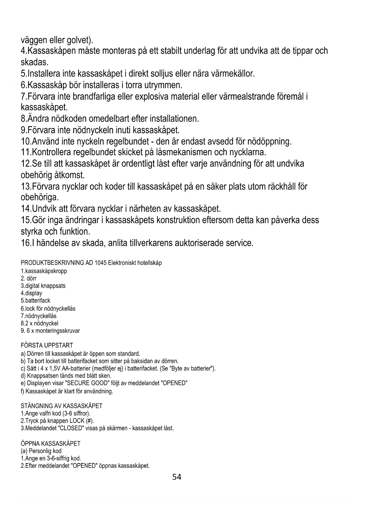 VIKTIGA SÄKERHETSANVISNINGAR FÖR ANVÄNDNING LÄS NOGA OCH SPARA FÖR FRAMTIDA BRUK 1.Läs igenom bruksanvisningen innan du använder apparaten och följ anvisningarna i den. Tillverkaren ansvarar inte för skador som orsakas av att apparaten används på ett sätt som inte överensstämmer med dess avsedda användning eller av felaktig hantering. 2.Var särskilt försiktig när du använder apparaten när barn är i närheten. Låt inte barn leka med apparaten. Låt inte barn eller personer som inte är bekanta med apparaten använda den. 3.Före första användningen ska kassaskåpet monteras på en fast plats (t.ex. på54 väggen eller golvet). 4.Kassaskåpen måste monteras på ett stabilt underlag för att undvika att de tippar och skadas. 5.Installera inte kassaskåpet i direkt solljus eller nära värmekällor. 6.Kassaskåp bör installeras i torra utrymmen. 7.Förvara inte brandfarliga eller explosiva material eller värmealstrande föremål i kassaskåpet. 8.Ändra nödkoden omedelbart efter installationen. 9.Förvara inte nödnyckeln inuti kassaskåpet. 10.Använd inte nyckeln regelbundet - den är endast avsedd för nödöppning. 11.Kontrollera regelbundet skicket på låsmekanismen och nycklarna. 12.Se till att kassaskåpet är ordentligt låst efter varje användning för att undvika obehörig åtkomst. 13.Förvara nycklar och koder till kassaskåpet på en säker plats utom räckhåll för obehöriga. 14.Undvik att förvara nycklar i närheten av kassaskåpet. 15.Gör inga ändringar i kassaskåpets konstruktion eftersom detta kan påverka dess styrka och funktion. 16.I händelse av skada, anlita tillverkarens auktoriserade service. PRODUKTBESKRIVNING AD 1045 Elektroniskt hotellskåp 1.kassaskåpskropp