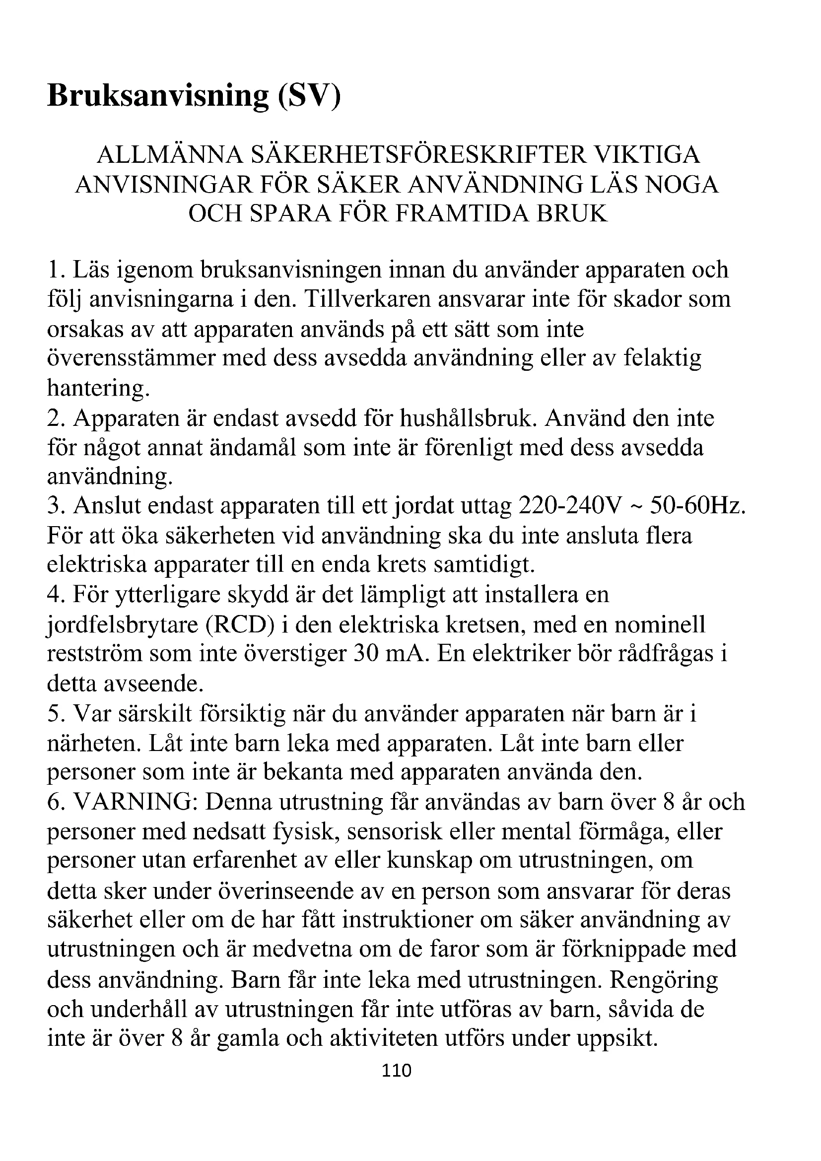 personer med nedsatt fysisk, sensorisk eller mental förmåga, eller personer utan erfarenhet av eller kunskap om utrustningen, om detta sker under överinseende av en person som ansvarar för deras säkerhet eller om de har fått instruktioner om säker användning av utrustningen och är medvetna om de faror som är förknippade med dess användning. Barn får inte leka med utrustningen. Rengöring och underhåll av utrustningen får inte utföras av barn, såvida de inte är över 8 år gamla och aktiviteten utförs under uppsikt.111