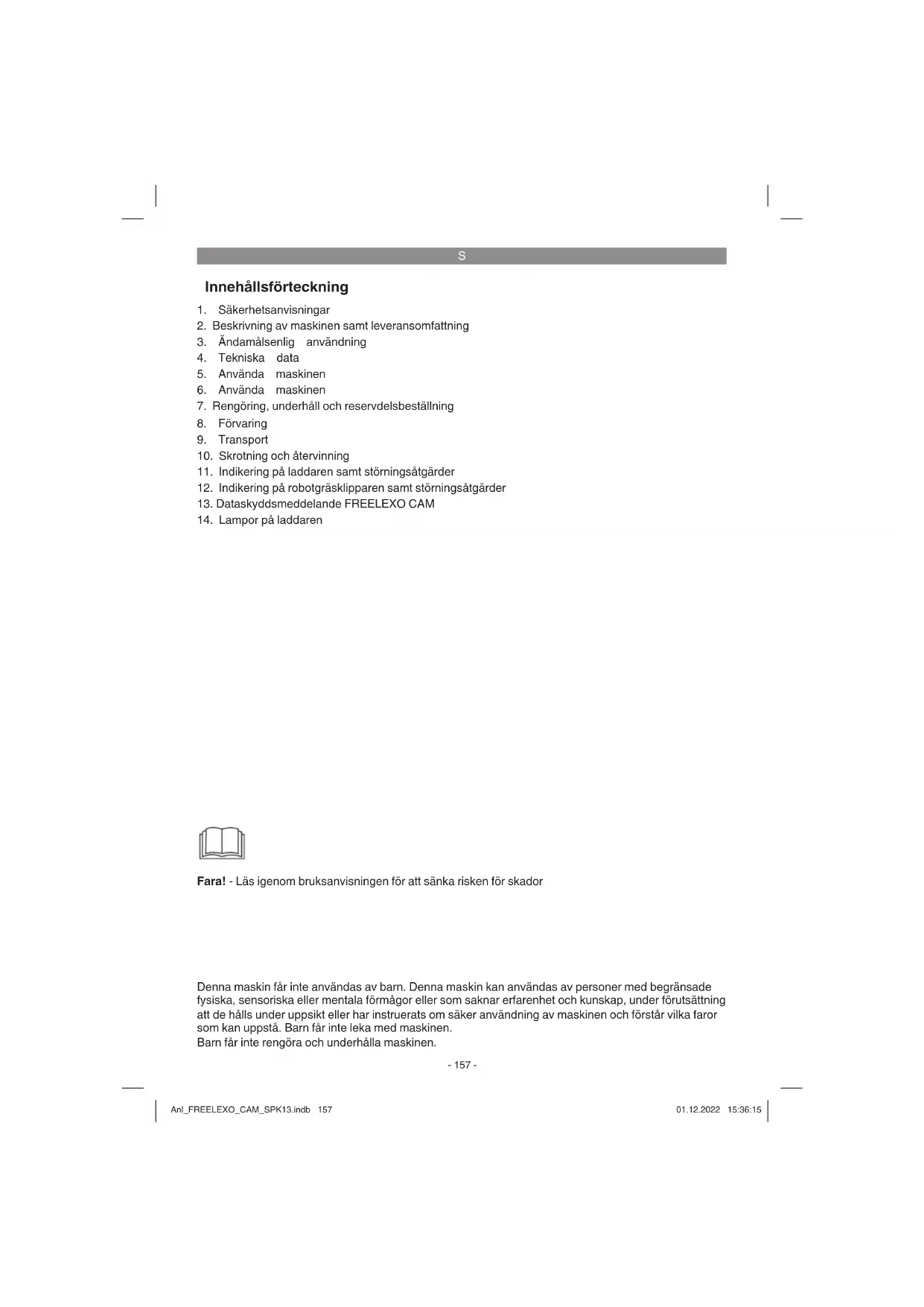 Fara! - Läs igenom bruksanvisningen för att sänka risken för skador Denna maskin får inte användas av barn. Denna maskin kan användas av personer med begränsade fysiska, sensoriska eller mentala förmågor eller som saknar erfarenhet och kunskap, under förutsättning att de hålls under uppsikt eller har instruerats om säker användning av maskinen och förstår vilka faror som kan uppstå. Barn får inte leka med maskinen. Barn får inte rengöra och underhålla maskinen. Anl_FREELEXO_CAM_SPK13.indb 157Anl_FREELEXO_CAM_SPK13.indb 157 01.12.2022 15:36:1501.12.2022 15:36:15S