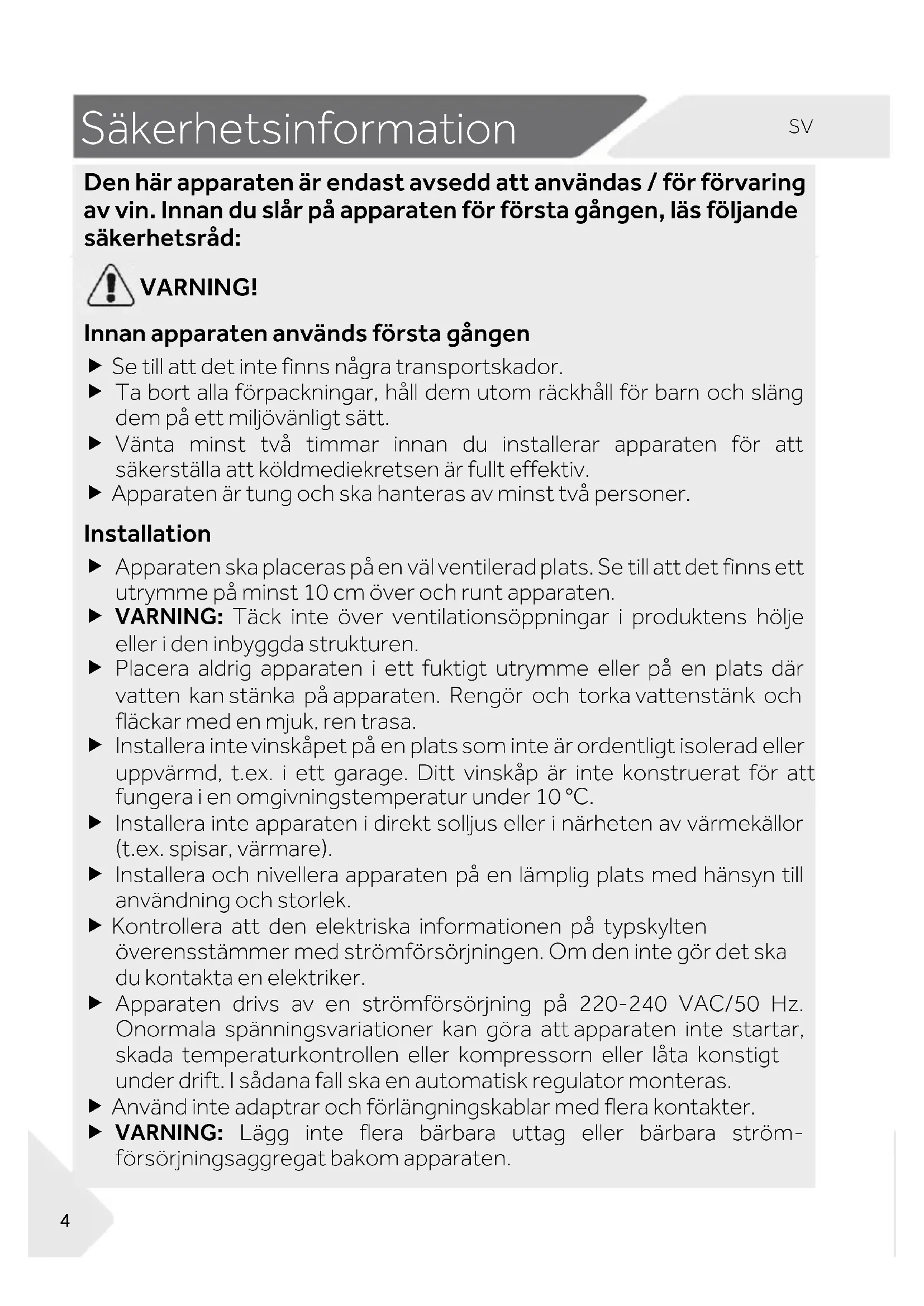 VARNING! Innan apparaten används första gången Se till att det inte finns några transportskador. Ta bort alla förpackningar, håll dem utom räckhåll för barn och släng dem på ett miljövänligt sätt. Vänta minst två timmar innan du installerar apparaten för att säkerställa att köldmediekretsen är fullt effektiv. Apparaten är tung och ska hanteras av minst två personer. Installation Apparaten ska placeras på en väl ventilerad plats. Se till att det finns ett utrymme på minst 10 cm över och runt apparaten. VARNING: Täck inte över ventilationsöppningar i produktens hölje eller i den inbyggda strukturen. Placera aldrig apparaten i ett fuktigt utrymme eller på en plats där vatten kan stänka på apparaten. Rengör och torka vattenstänk och fläckar med en mjuk, ren trasa. Installera inte vinskåpet på en plats som inte är ordentligt isolerad eller uppvärmd, t.ex. i ett garage. Ditt vinskåp är inte konstruerat för att fungera i en omgivningstemperatur under 10 °C. Installera inte apparaten i direkt solljus eller i närheten av värmekällor (t.ex. spisar, värmare). Installera och nivellera apparaten på en lämplig plats med hänsyn till användning och storlek. Kontrollera att den elektriska informationen på typskylten överensstämmer med strömförsörjningen. Om den inte gör det ska du kontakta en elektriker. Apparaten drivs av en strömförsörjning på 220-240 VAC/50 Hz. Onormala spänningsvariationer kan göra att apparaten inte startar, skada temperaturkontrollen eller kompressorn eller låta konstigt under drift. I sådana fall ska en automatisk regulator monteras. Använd inte adaptrar och förlängningskablar med flera kontakter. VARNING: Lägg inte flera bärbara uttag eller bärbara ström- försörjningsaggregat bakom apparaten.5