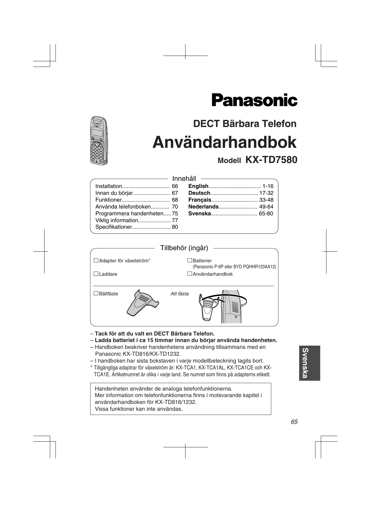 - Tillgängliga adaptrar för växelström är: KX-TCA1, KX-TCA1AL, KX-TCA1CE och KXTCA1E. Artikelnumret är olika i varje land. Se numret som finns på adapterns etikett. Handenheten använder de analoga telefonfunktionerna. Mer information om telefonfunktionerna finns i motsvarande kapitel i användarhandboken för KX-TD816/1232. Vissa funktioner kan inte användas.