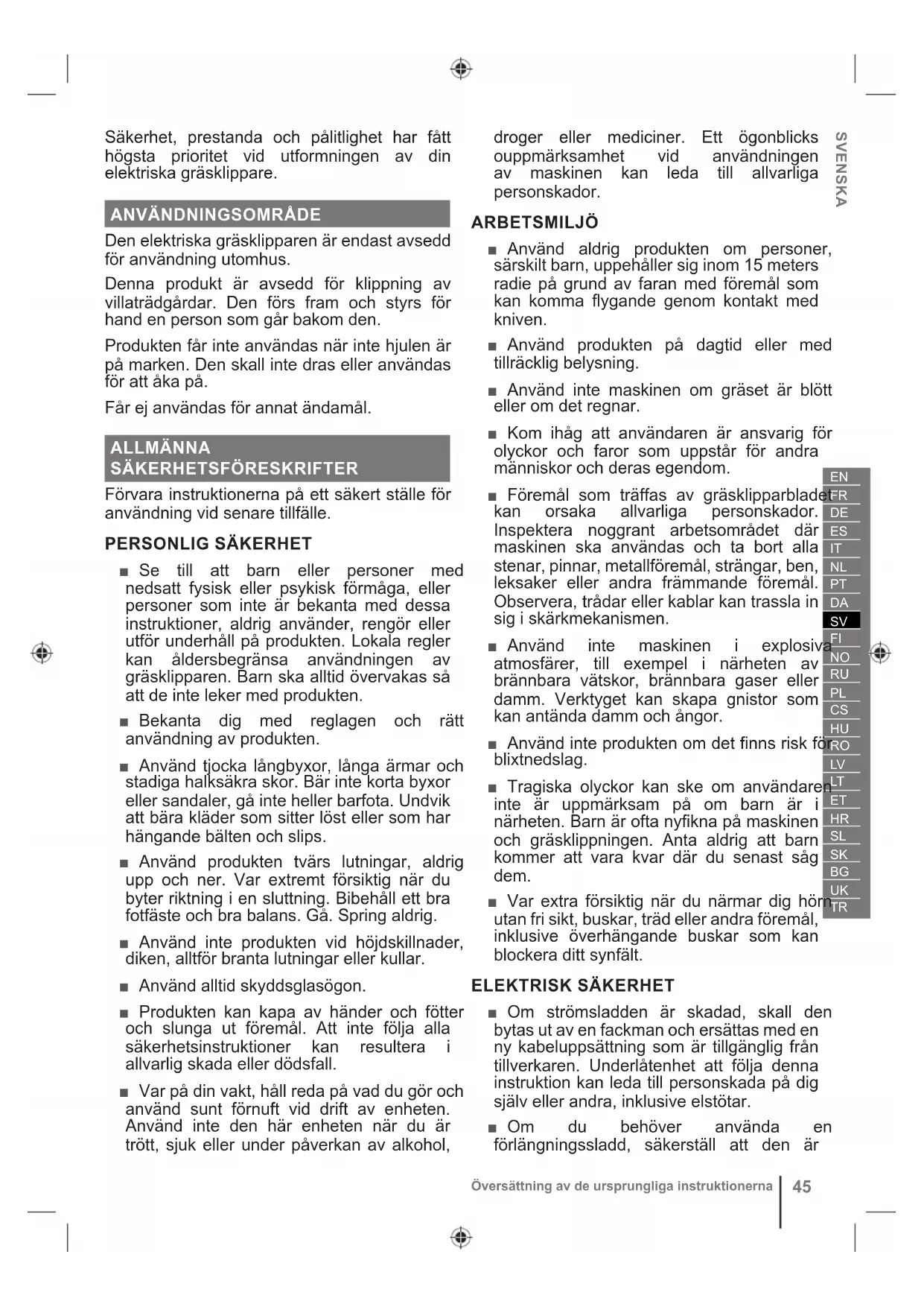 Läs och se till att du förstår alla anvisningar innan du använder produkten. Följ alla varningar och säkerhetsanvisningar. Använd hörselskydd Bär ögonskydd Använd inte produkten på lutande ytor som överstiger 15 °. Klipp längst med sluttningar, aldrig uppåt eller nedåt. Utsätt inte för regn eller våta omgivningar. Var försiktig med vassa blad. Bladen fortsätter rotera efter att motorn har stängts av. Ta ut kontakten från elnätet innan underhåll eller om sladden är skadad. Se upp för kringkastade eller fl ygande föremål. Alla åskådare, särskilt barn och husdjur, ska befi nna sig minst 15 m från arbetsområdet. Håll strömsladden borta från skärbladen.SVENSKA