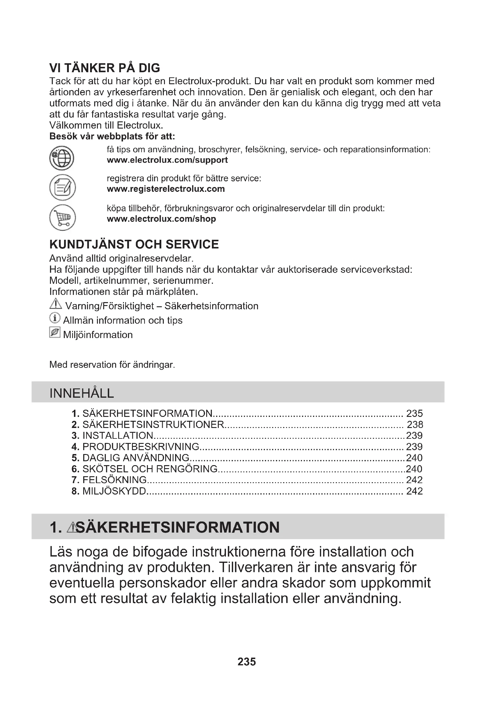 Tack for att du har kopt en Electrolux-product. Du har valt en produit somkommen med artionden av yrkeserfarenhet och innovation. Den ar genialisk och elegant, och den har utformats med dig i atanke. När du an anvander den kan du kanna dig trygg med att veta att du far fantastiska resultat varje gang.