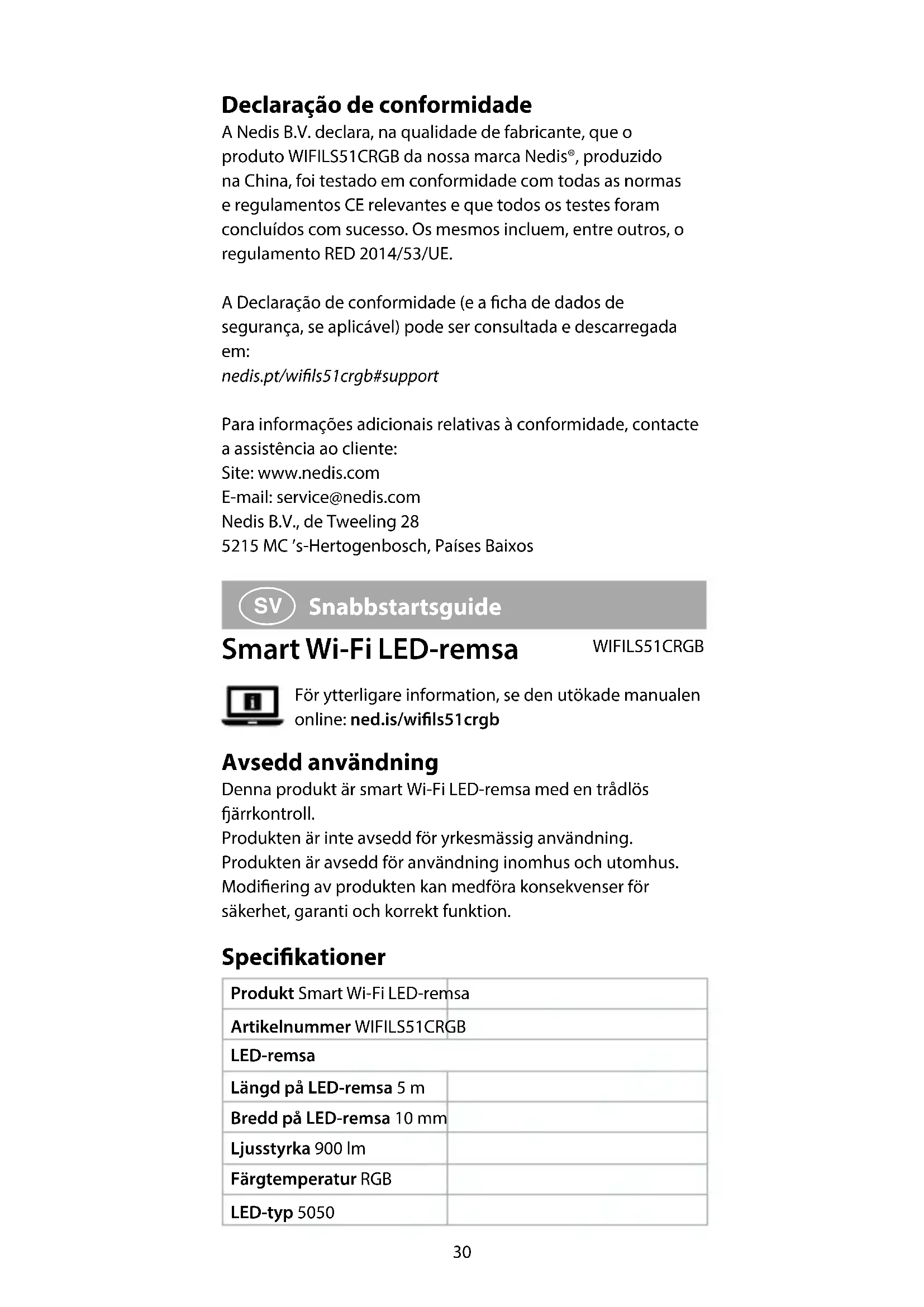 Produkten kan anslutas till Google Home eller Amazon Alexa för att aktivera röststyrning. Försäkran om överensstämmelse Vi, Nedis B.V., försäkrar som tillverkare att produkten WIFILS51CRGB från vårt varumärke Nedis®, tillverkad i Kina, har testats i enlighet med alla relevanta CE-standarder och föreskrifter och att alla tester genomförts med godkänt resultat. Detta inkluderar, men är inte begränsat till, radioutrustningsdirektivet 2014/53/EU. Den fullständiga försäkran om överensstämmelse (och säkerhetsdatabladet, om tillämpligt) kan läsas och laddas ned från: nedis.sv/wils51crgb#support För ytterligare information om överensstämmelse, var god kontakta vår kundtjänst: Webbplats: www.nedis.com E-post: service@nedis.com Nedis B.V., de Tweeling 28 5215 MC ’s-Hertogenbosch, Nederländerna34