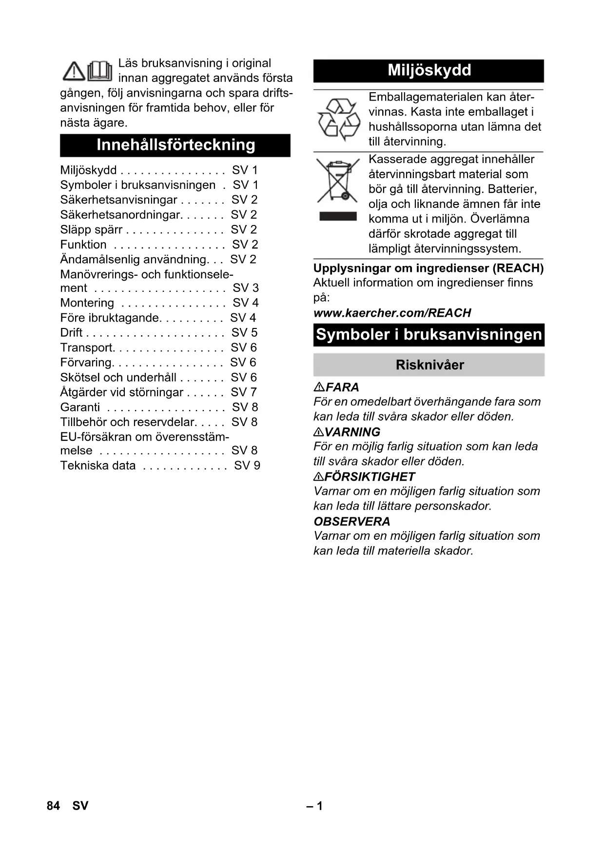 Støy Støynivå (EN 60704-1) dB(A) 56 61,3 Maskinvibrasjon Svingningsverdi iht. ISO 5349 m/s² 0,35 0,78 83NO– 1 Läs bruksanvisning i original innan aggregatet används första gången, följ anvisningarna och spara drifts- anvisningen för framtida behov, eller för nästa ägare. Upplysningar om ingredienser (REACH) Aktuell information om ingredienser finns på: www.kaercher.com/REACH FARA För en omedelbart överhängande fara som kan leda till svåra skador eller döden. 몇 VARNING För en möjlig farlig situation som kan leda till svåra skador eller döden. 몇 FÖRSIKTIGHET Varnar om en möjligen farlig situation som kan leda till lättare personskador. OBSERVERA Varnar om en möjligen farlig situation som kan leda till materiella skador. Innehållsförteckning Miljöskydd . . . . . . . . . . . . . . . . SV 1 Symboler i bruksanvisningen . SV 1 Säkerhetsanvisningar . . . . . . . SV 2 Säkerhetsanordningar. . . . . . . SV 2 Släpp spärr . . . . . . . . . . . . . . . SV 2 Funktion . . . . . . . . . . . . . . . . . SV 2 Ändamålsenlig användning. . . SV 2 Manövrerings- och funktionsele- ment . . . . . . . . . . . . . . . . . . . . SV 3 Montering . . . . . . . . . . . . . . . . SV 4 Före ibruktagande. . . . . . . . . . SV 4 Drift . . . . . . . . . . . . . . . . . . . . . SV 5 Transport. . . . . . . . . . . . . . . . . SV 6 Förvaring. . . . . . . . . . . . . . . . . SV 6 Skötsel och underhåll . . . . . . . SV 6 Åtgärder vid störningar . . . . . . SV 7 Garanti . . . . . . . . . . . . . . . . . . SV 8 Tillbehör och reservdelar. . . . . SV 8 EU-försäkran om överensstäm- melse . . . . . . . . . . . . . . . . . . . SV 8 Tekniska data . . . . . . . . . . . . . SV 9 Miljöskydd Emballagematerialen kan åter- vinnas. Kasta inte emballaget i hushållssoporna utan lämna det till återvinning. Kasserade aggregat innehåller återvinningsbart material som bör gå till återvinning. Batterier, olja och liknande ämnen får inte komma ut i miljön. Överlämna därför skrotade aggregat till lämpligt återvinningssystem. Symboler i bruksanvisningen Risknivåer 84 SV– 2 Läs noga denna bruksanvisning och bifo- gade broschyr, Säkerhetsanvisningar för våt/torrsug nr. 5.956-659, innan maskinen tas i bruk första gången. Säkerhetsanordningarna ger skydd åt an- vändaren och får varken sättas ur drift eller förbikopplas. Förhindrar oavsiktlig start av aggregatet. Maskinen är avsedd att användas till pole- ring av golv med jämn yta. Dammet som bildas vid poleringen samlas i en utbytbar filterpåse. – En arbetsbredd på 500 mm ger möjlig- het till effektiv användning. – Nätdrift ger hög effekt utan begränsning i användningstid. Använd maskinen enbart för de ändamål som beskrivs i denna bruksanvisning. – Apparaten får endast användas till pole- ring av blanka golv. – Maskinen får endast utrustas med till- behör och reservdelar i originalutföran- de. – Maskinen är inte lämplig för användning inom områden med explosionsrisk. – Aggregatet är endast avsett för torra ar- beten och får inte användas, eller förva- ras, utomhus i fuktig omgivning. Säkerhetsanvisningar Säkerhetsanordningar Släpp spärr Funktion Ändamålsenlig användning 85SV– 3 1 Reglage höger 2 Spak för inställning av vinkel 3 Nätkabel med nätkontakt 4 Eluttag (endast för tillbehör som god- känts av tillverkaren) 5 Reglage vänster 6 Spärr vänster 7 Kontrollampa "Nätspänning finns“ 8 Spärr höger 9 Handtag 10 Sladdlindningshake, vridbar 11 Stickkontakt styrledning 12 Vakuumskydd Manövrerings- och funktionselement