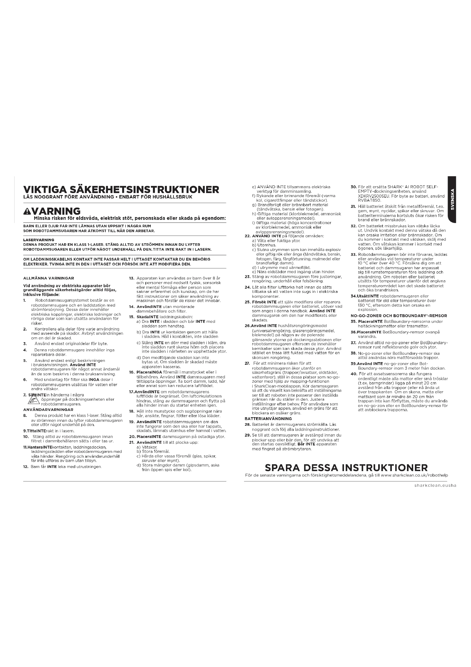 SharkClean.co.uk/EULA MUISTIINPANOJA SUOMIsharkclean.eusharkclean.eu VARNING Minska risken för eldsvåda, elektrisk stöt, personskada eller skada på egendom: