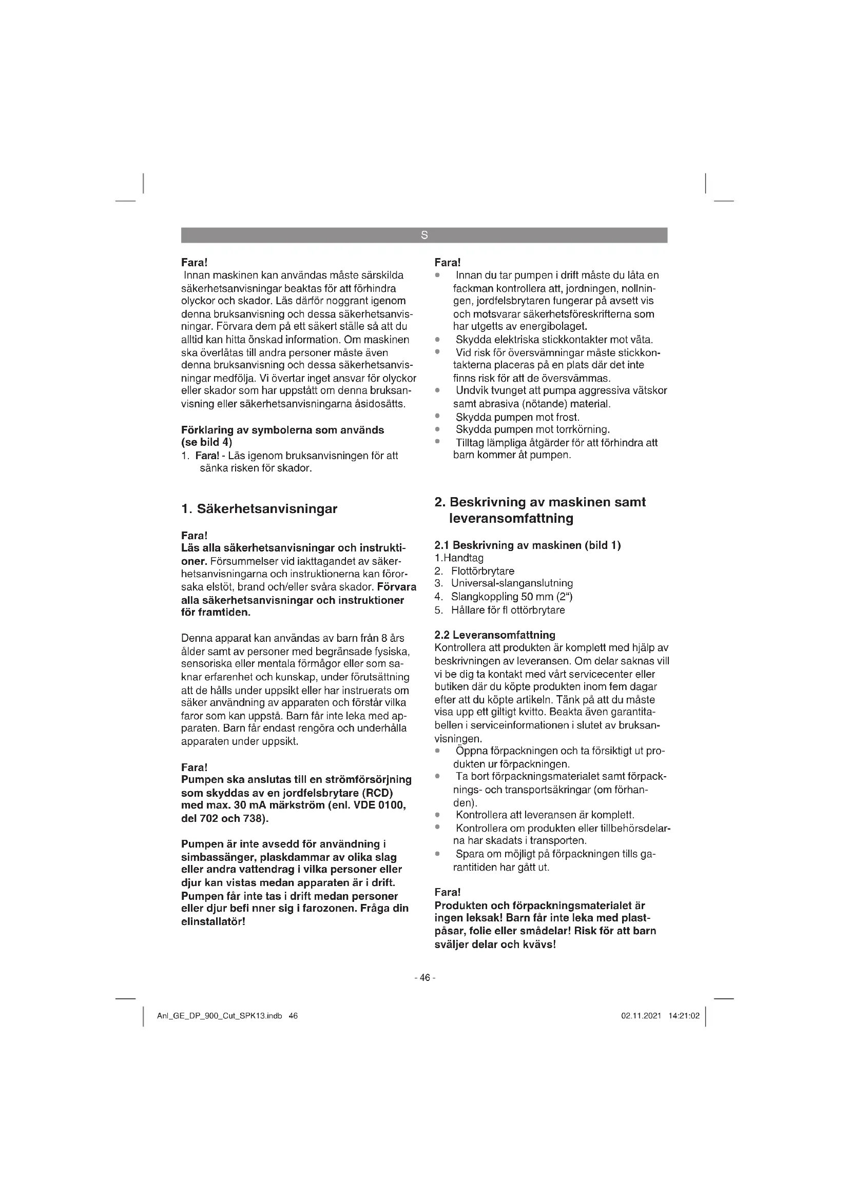 Spara om möjligt på förpackningen tills ga- rantitiden har gått ut. Fara! Produkten och förpackningsmaterialet är ingen leksak! Barn får inte leka med plast- påsar, folie eller smådelar! Risk för att barn sväljer delar och kvävs! Anl_GE_DP_900_Cut_SPK13.indb 46Anl_GE_DP_900_Cut_SPK13.indb 46 02.11.2021 14:21:0202.11.2021 14:21:02S