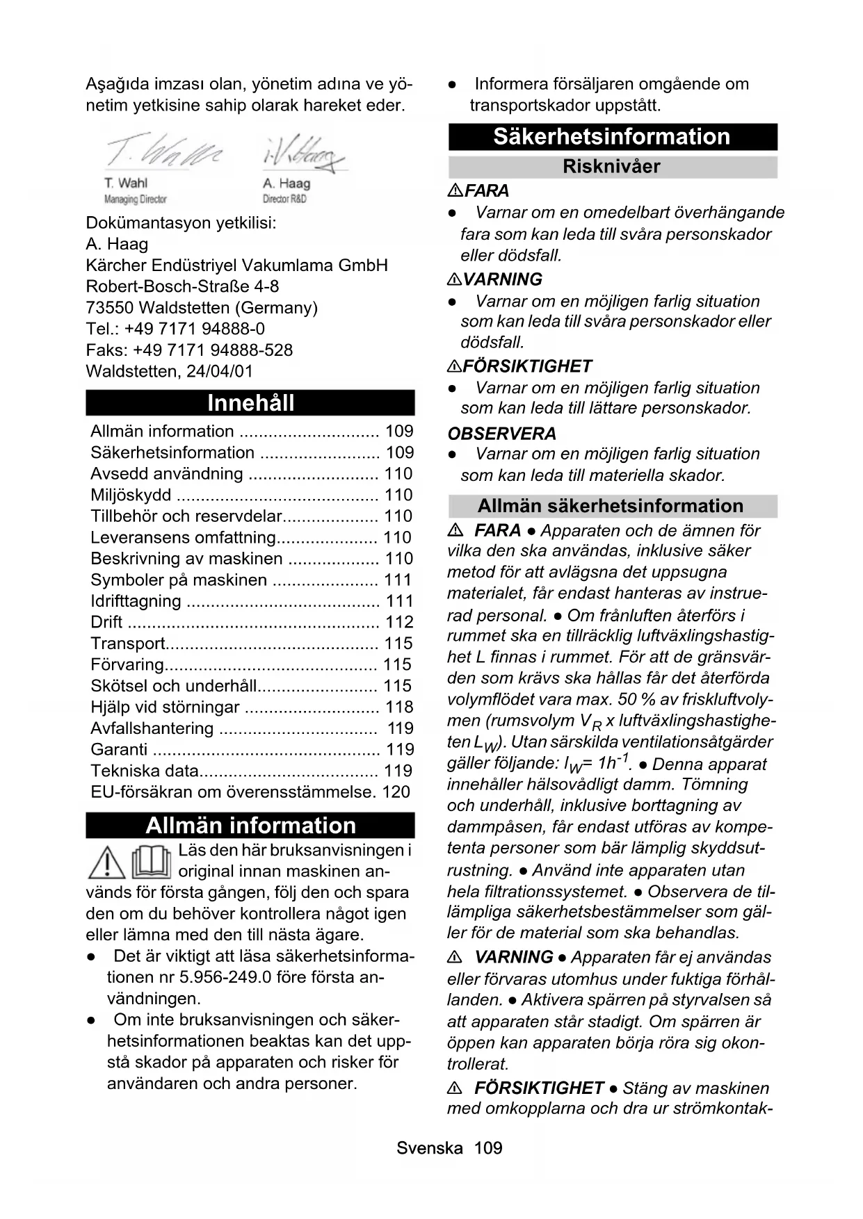 Kablo uzunluğum10Svenska 109 Aşağıda imzası olan, yönetim adına ve yö- netim yetkisine sahip olarak hareket eder. Dokümantasyon yetkilisi: A. Haag Kärcher Endüstriyel Vakumlama GmbH Robert-Bosch-Straße 4-8 73550 Waldstetten (Germany) Tel.: +49 7171 94888-0 Faks: +49 7171 94888-528 Waldstetten, 24/04/01 Innehåll Allmän information Läs den här bruksanvisningen i original innan maskinen an- vänds för första gången, följ den och spara den om du behöver kontrollera något igen eller lämna med den till nästa ägare. ● Det är viktigt att läsa säkerhetsinforma- tionen nr 5.956-249.0 före första an- vändningen. ● Om inte bruksanvisningen och säker- hetsinformationen beaktas kan det upp- stå skador på apparaten och risker för användaren och andra personer. ● Informera försäljaren omgående om transportskador uppstått. Säkerhetsinformation Risknivåer FARA ● Varnar om en omedelbart överhängande fara som kan leda till svåra personskador eller dödsfall. 몇 VARNING ● Varnar om en möjligen farlig situation som kan leda till svåra personskador eller dödsfall. 몇 FÖRSIKTIGHET ● Varnar om en möjligen farlig situation som kan leda till lättare personskador. OBSERVERA ● Varnar om en möjligen farlig situation som kan leda till materiella skador. Allmän säkerhetsinformation FARA ● Apparaten och de ämnen för vilka den ska användas, inklusive säker metod för att avlägsna det uppsugna materialet, får endast hanteras av instrue- rad personal. ● Om frånluften återförs i rummet ska en tillräcklig luftväxlingshastig- het L finnas i rummet. För att de gränsvär- den som krävs ska hållas får det återförda volymflödet vara max. 50 % av friskluftvoly- men (rumsvolym V