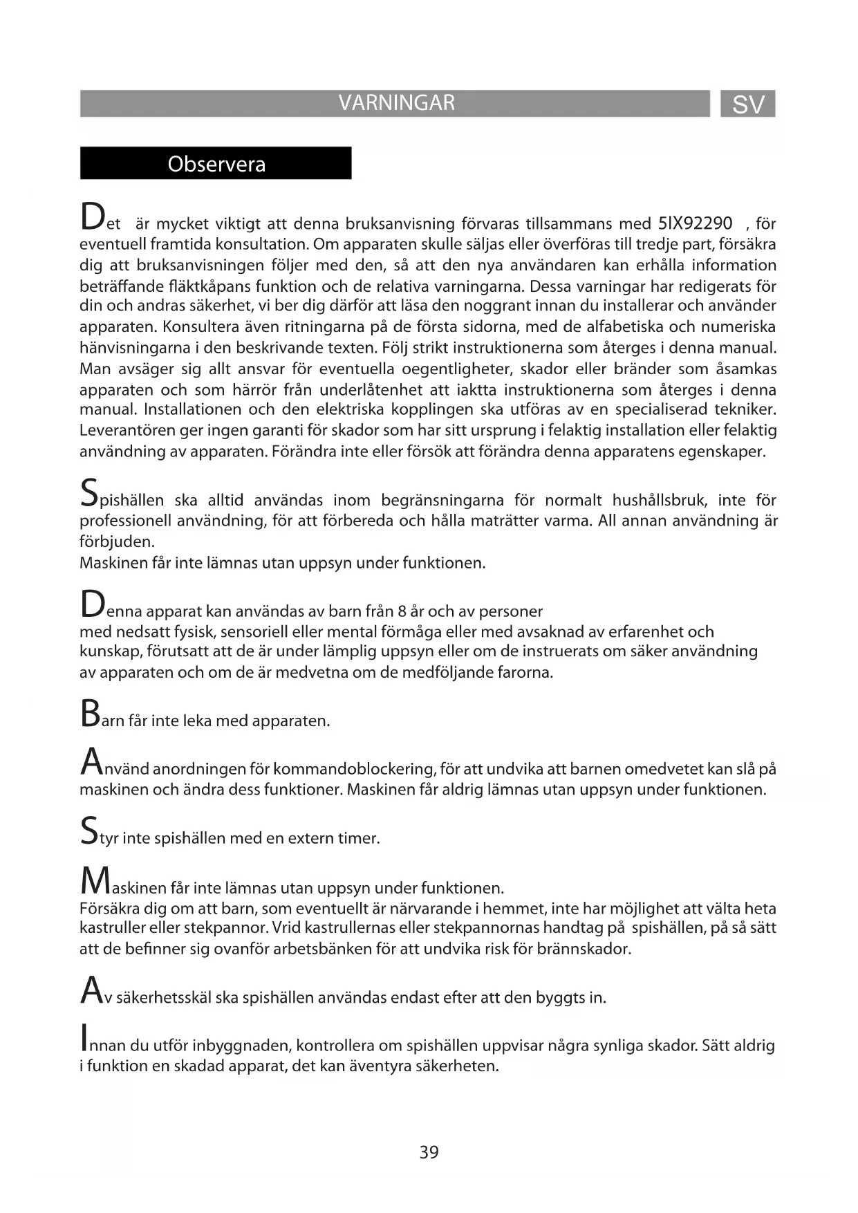 VARNINGAR Observera Det är mycket viktigt att denna bruksanvisning förvaras tillsammans med 5IX92290 , för eventuell framtida konsultation. Om apparaten skulle säljas eller överföras till tredje part, försäkra dig att bruksanvisningen följer med den, så att den nya användaren kan erhålla information beträande äktkåpans funktion och de relativa varningarna. Dessa varningar har redigerats för din och andras säkerhet, vi ber dig därför att läsa den noggrant innan du installerar och använder apparaten. Konsultera även ritningarna på de första sidorna, med de alfabetiska och numeriska hänvisningarna i den beskrivande texten. Följ strikt instruktionerna som återges i denna manual. Man avsäger sig allt ansvar för eventuella oegentligheter, skador eller bränder som åsamkas apparaten och som härrör från underlåtenhet att iaktta instruktionerna som återges i denna manual. Installationen och den elektriska kopplingen ska utföras av en specialiserad tekniker. Leverantören ger ingen garanti för skador som har sitt ursprung i felaktig installation eller felaktig användning av apparaten. Förändra inte eller försök att förändra denna apparatens egenskaper. Spishällen ska alltid användas inom begränsningarna för normalt hushållsbruk, inte för professionell användning, för att förbereda och hålla maträtter varma. All annan användning är förbjuden. Maskinen får inte lämnas utan uppsyn under funktionen. Denna apparat kan användas av barn från 8 år och av personer med nedsatt fysisk, sensoriell eller mental förmåga eller med avsaknad av erfarenhet och kunskap, förutsatt att de är under lämplig uppsyn eller om de instruerats om säker användning av apparaten och om de är medvetna om de medföljande farorna. Barn får inte leka med apparaten. Använd anordningen för kommandoblockering, för att undvika att barnen omedvetet kan slå på maskinen och ändra dess funktioner. Maskinen får aldrig lämnas utan uppsyn under funktionen. Styr inte spishällen med en extern timer. Maskinen får inte lämnas utan uppsyn under funktionen. Försäkra dig om att barn, som eventuellt är närvarande i hemmet, inte har möjlighet att välta heta kastruller eller stekpannor. Vrid kastrullernas eller stekpannornas handtag på spishällen, på så sätt att de benner sig ovanför arbetsbänken för att undvika risk för brännskador. Av säkerhetsskäl ska spishällen användas endast efter att den byggts in. Innan du utför inbyggnaden, kontrollera om spishällen uppvisar några synliga skador. Sätt aldrig i funktion en skadad apparat, det kan äventyra säkerheten. SVANWEISUNGEND