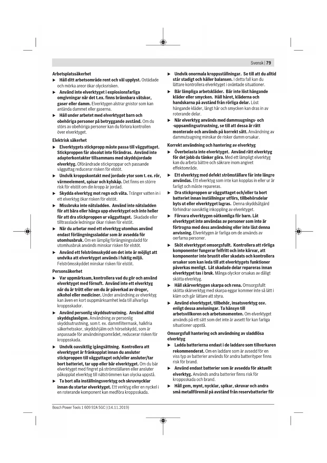 1,5 1,5 Den vibrationsnivå och det bullervärde som anges i dessa anvisningar har uppmätts enligt en mätmetod som normerats och kan användas för att jämföra elverktyg med varandra. Mätmetoden är även lämplig för preliminär bedömning av vibrations- och bullernivån. Den angivna vibrations- och bullernivån representerar den huvudsakliga användningen av elverktyget. Om däremot elverktyget används för andra ändamål, med andra insatsverktyg eller inte underhållits ordentligt kan vibrations- och bullernivån avvika. Då kan vibrations- och bullernivån under arbetsperioden öka betydligt under hela arbetstiden. För en exakt bedömning av vibrations- och bullernivån bör även de tider beaktas när elverktyget är avstängt eller är igång, men inte används. Detta reducerar vibrations- och bullerbelastningen för den totala arbetsperioden betydligt. Bestäm extra säkerhetsåtgärder för att skydda operatören mot vibrationernas inverkan t.ex.: underhåll av elverktyget och insatsverktygen, att hålla händerna varma, organisation av arbetsförloppen. Montering u Sätt vridriktningsomkopplaren i mittläge innan alla arbeten på apparaten (t.ex. underhåll, verktygsbyte etc.) samt före transport och lagring. Om strömställaren Till/Från oavsiktligt påverkas finns risk för personskada. Batteriets laddning u Använd endast de laddare som anges i tekniska data. Endast denna typ av laddare är anpassad till det litium- jonbatteri som används i elverktyget. Anmärkning: Batteriet levereras delvis laddat. För full effekt ska batteriet före första användningen laddas upp i laddaren. Litiumjonbatteriet kan när som helst laddas upp eftersom detta inte påverkar livslängden. Batteriet skadas inte om laddning avbryts. Lithiumjonbatteriet är skyddat mot djupurladdning genom "Electronic Cell Protection (ECP)". Vid urladdat batteri kopplar skyddskopplingen från elverktyget: Insatsverktyget roterar inte längre. u Undvik att trycka på strömställaren Till/Från efter en automatisk frånkoppling av elverktyget. Batteriet kan skadas. Beakta anvisningarna för avfallshantering. Borttagning av batteri Ackumulatorn(14) är försedd med två låssteg som hindrar ackumulatorn från att falla ut om dess upplåsningsknapp(10) faller ut. När batteriet är insatt i elverktyget hålls den med en fjäder i rätt läge. – För att ta ut batteriet (14), tryck på upplåsningsknappen (10) och dra batteriet ur elverktyget. Bruka inte våld. Indikering batteristatus De tre gröna LED-lamporna på indikeringen för batteristatus visar batteriets laddningsnivå. Av säkerhetsskäl kan man endast kontrollera batteristatus när elverktyget är stilla. Tryck på knappen för indikering av batteristatus eller , för att visa batteriets laddningsnivå. Detta är möjligt även då batteriet är uttaget. Om ingen LED-lampa lyser efter ett tryck på knappen för batteristatus är batteriet defekt och måste bytas ut. Batterityp GBA 18V... LED Kapacitet Fast ljus 3× grönt 60−100% Fast ljus 2× grönt 30−60% 1 609 92A 5GC | (14.11.2019) Bosch Power ToolsSvensk | 83 LED Kapacitet Fast ljus 1× grönt 5−30% Blinkande ljus 1× grön 0−5% Batterityp ProCORE18V... LED Kapacitet Fast ljus 5× grönt 80−100 % Fast ljus 4× grönt 60−80 % Fast ljus 3× grönt 40−60 % Fast ljus 2× grönt 20−40 % Fast ljus 1× grönt 5−20 % Blinkande ljus 1× grön 0−5 % Tilläggshandtag u Använd endast ditt elverktyg med tilläggshandtaget (19). Vrid tilläggshandtaget (se bild A) Du kan vrida tilläggshandtaget (19) som du vill för att få en säker och mindre uttröttande arbetsställning. – Vrid det nedre greppet på tilläggshandtaget (19) motsols och vrid tilläggshandtaget (19) till önskad position. Dra åt det nedre handtaget på stödhandtaget (19) medsols igen. Se till att spännbandet på tilläggshandtaget ligger i avsett spår på höljet. Välja chuck och verktyg För hammarborrning och mejsling behöver du SDS-plus- verktygen som monteras i SDS-plus-chucken. För borrning utan slag i trä, metall, keramik och plast samt för skruvdragning används verktyg utan SDS-plus (t. ex. borrar med cylindriskt skaft). Dessa verktyg kräver en snabbchuck eller en kuggkranschuck. Sätta in/ta ut kuggkranschuck (GBH18V-26) Montera kuggkranschucken (se bild B) – Skruva in SDS-plus-fästet (23) i en kuggkranschuck (22). Lås kuggkranschucken (22) med låsskruven (21). Observera att låsskruven är vänstergängad. Sätta i kuggkranschucken (se bild B) – Rengör insticksänden på fästet och smörj den lätt. – Skjut med en vridningsrörelse in kuggkranschucken med universalhållaren i verktygsfästet tills den automatiskt låses. – Kontrollera låsningen genom att dra i kuggkranschucken. Ta ut kuggkranschucken – Skjut låshylsan (5) bakåt och ta av kuggkranschucken (22). Ta ut/sätta in växelchucken (GBH18V-26F) Ta ut växelborrchucken (se bild C) – Dra växelborrchuckens låsring (6) bakåt, håll den i detta läge och dra sedan bort SDS-plus växelborrchucken (2) eller snabbväxelborrchucken (1) framåt. – Skydda växelborrchucken mot smuts efter att den har tagits av. Sätt in växelborrchucken (se bild D) u Använd endast modellspecifik originalutrustning och beakta antalet kodspår (25). Endast växelborrchuckar med två eller tre kodspår är tillåtna. Om en växelborrchuck som inte är lämplig för detta elverktyg används kan insatsverktyget falla ur under användningen. – Rengör växelborrchucken innan användning och smörj insticksänden lätt. – Grip med hela handen om SDS-plus växelborrchucken (2) eller snabbväxelchucken (1). Skjut med en vridande rörelse upp växelborrchucken på chuckfästet (24) tills ett tydligt låsningsljud hörs. – Växelborrchucken låser automatiskt. Kontrollera låsningen genom att dra i växelborrchucken. Verktygsbyte Dammskyddskåpan (4) hindrar i stor utsträckning borrdamm från att tränga in i verktygsfästet under arbe