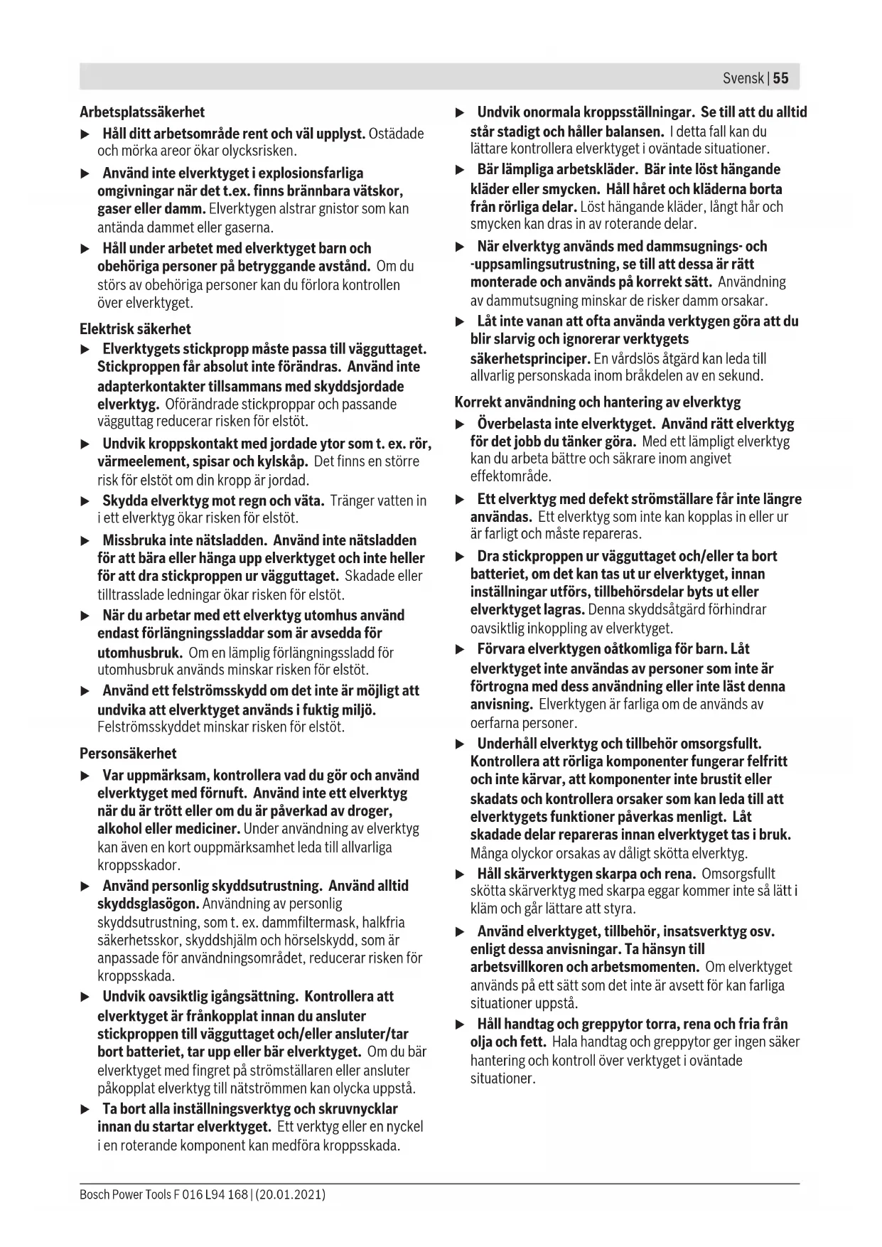 1,5 1,5 1,5 Att det/de angivna totala vibrationsemissionsvärdet/- värdena och det/de angivna bulleremissionsvärdet/-värdena har uppmätts enligt en standardiserad sträng kontroll och kan användas till jämförelse med ett annat elverktyg. F 016 L94 168 | (20.01.2021) Bosch Power ToolsSvensk | 59 Att det/de angivna totala vibrationsemissionsvärdet/- värdena och det/de angivna bulleremissionsvärdet/-värdena också kan användas för en preliminär bedömning av belastningen. Att vibrations- och bulleremissionsvärden vid elverktygets faktiska användning kan avvika från angivna värden, beroende på vilket sätt elverktyget används, speciellt vilket slags arbetsstycke bearbetas, och – nödvändigt, för att fastslå säkerhetsåtgärder för användarens skydd som grundar sig på en värdering av vibrationsbelastningen vid verkliga användningsförhållanden (härvid måste alla andelar av driftscykeln beaktas, till exempel tiden under vilken elverktyget är avstängt och den tid verktyget visserligen är inkopplat men fungerar utan belastning). Bullernivåvärde förmedlas enligt EN 62841-4-2:2019. Elverktygets A-vägda ljudnivå uppnår i typiska fall: Ljudtrycksnivå 75 dB(A); ljudeffektnivå 95 dB(A). Onoggrannhet K =2,0dB. Bär hörselskydd! Totala vibrationsemissionsvärden a