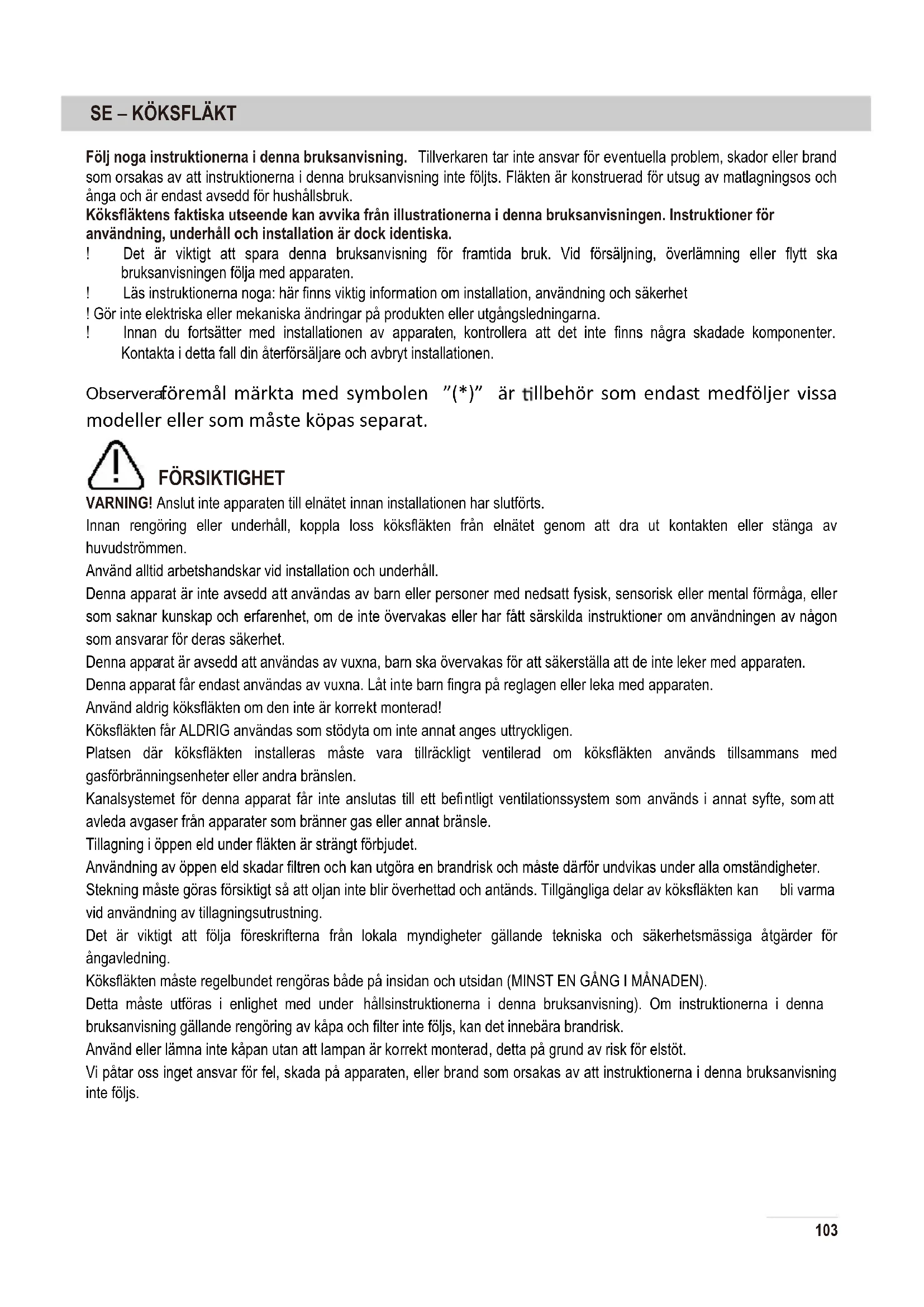 Kontrolna tabla A – Taster za paljenje osvetljenja B – Taster za isključenje C – Taster za regulisanje brzine rada aspiratora 102Följ noga instruktionerna i denna bruksanvisning. Tillverkaren tar inte ansvar för eventuella problem, skador eller brand som orsakas av att instruktionerna i denna bruksanvisning inte följts. Fläkten är konstruerad för utsug av matlagningsos och ånga och är endast avsedd för hushållsbruk. Köksfläktens faktiska utseende kan avvika från illustrationerna i denna bruksanvisningen. Instruktioner för användning, underhåll och installation är dock identiska. ! Det är viktigt att spara denna bruksanvisning för framtida bruk. Vid försäljning, överlämning eller flytt ska bruksanvisningen följa med apparaten. ! Läs instruktionerna noga: här finns viktig information om installation, användning och säkerhet ! Gör inte elektriska eller mekaniska ändringar på produkten eller utgångsledningarna. ! Innan du fortsätter med installationen av apparaten , kontrollera att det inte finns några skadade komponenter. Kontakta i detta fall din återförsäljare och avbryt installationen. Observera: föremål märkta med symbolen ”(*)” är llbehör som endast medföljer vissa modeller eller som måste köpas separat. FÖRSIKTIGHET VARNING! Anslut inte apparaten till elnätet innan installationen har slutförts. Innan rengöring eller underhåll, koppla loss köksfläkten från elnätet genom att dra ut kontakten eller stänga av huvudströmmen. Använd alltid arbetshandskar vid installation och underhåll. Denna apparat är inte avsedd att användas av barn eller personer med nedsatt fysisk, sensorisk eller mental förmåga, eller som saknar kunskap och erfarenhet, om de inte övervakas eller har fått särskilda instruktioner om användningen av någon som ansvarar för deras säkerhet. Denna appa rat är avsedd att användas av vuxna, barn ska övervakas för att säkerställa att de inte leker med apparaten. Denna apparat får endast användas av vuxna. Låt inte barn fingra på reglagen eller leka med apparaten. Använd aldrig köksfläkten om den inte är korrekt monterad! Köksfläkten får ALDRIG användas som stödyta om inte annat anges uttryckligen. Platsen där köksfläkten installeras måste vara tillräckligt ventilerad om köksfläkten används tillsammans med gasförbränningsenheter eller andra bränslen. Kanalsystemet för denna apparat får inte anslutas till ett befintligt ventilationssystem som används i annat syfte, som att avleda avgaser från apparater som bränner gas eller annat bränsle. Tillagning i öppen eld under fläkten är strängt förbjudet. Användning av öppen eld skadar filtren och kan utgöra en brandrisk och måste därför undvikas under alla omständigheter. Stekning måste göras försiktigt så att oljan inte blir överhettad och antänds. Tillgängliga delar av köksfläkten kan bli varma vid användning av tillagningsutrustning. Det är viktigt att följa föreskrifterna från lokala myndigheter gällande tekniska och säkerhetsmässiga åtgärder för ångavledning. Köksfläkten måste regelbundet rengöras både på insidan och utsidan (MINST EN GÅNG I MÅNADEN). Detta måste utföras i enlighet med under hållsinstruktionerna i denna bruksanvisning). Om instruktionerna i denna bruksanvisning gällande rengöring av kåpa och filter inte följs, kan det innebära brandrisk. Använd eller lämna inte kåpan utan att lampan är korrekt monterad, detta på grund av risk för elstöt. Vi påtar oss inget ansvar för fel, skada på apparaten, eller brand som orsakas av att instruktionerna i denna bruksanvisning inte följs.