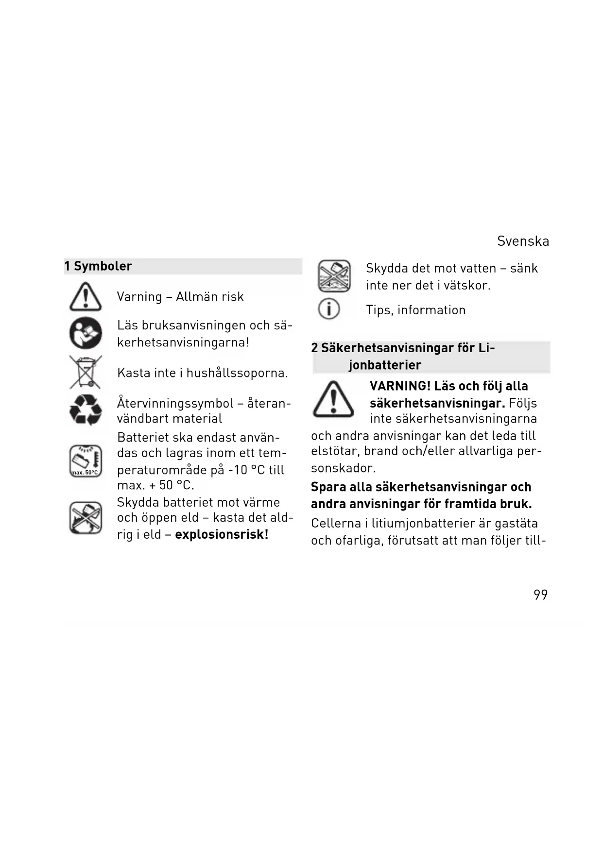 hantering av batteriet Batteriet är delvis laddat vid le veransen. För att garantera full Svenska 103effekt i batteriet ska det laddas upp helt i laddaren innan det an vänds första gången. Batteriet kan laddas när som helst utan att dess livslängd förkortas. Det skadas inte om laddningen avbryts. Tryck inte på strömbrytaren när elverktyget har stängts av automatiskt. Det kan ska da batteriet. Batteriet har en temperaturövervakning som endast tillåter laddning vid tempe raturer mellan 0 °C och 55 °C. Det gör att batteriet håller längre. – Förvara batteriet så svalt (5 °C till 25 °C) och torrt (luftfuktighet < 80 %) som möjligt. – Lämna till exempel inte ett batteri i bilen på sommaren. – Om batteritiden börjar förkortas vä sentligt efter uppladdningen betyder det att batteriet är förbrukat och mås te bytas. – Följ föreskrifterna för avfallshanter ing.