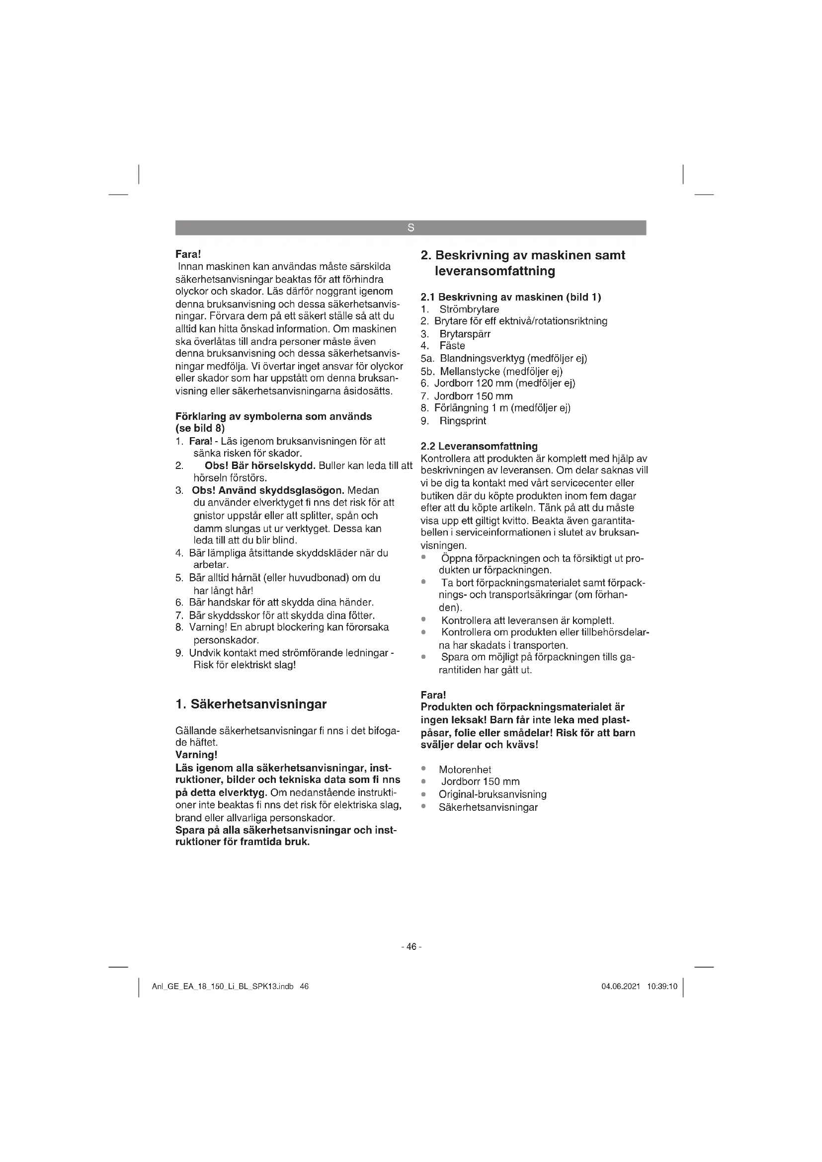 armvibrationer om maskinen används under längre tid eller om det inte hanteras och un- derhålls enligt föreskrift. Anl_GE_EA_18_150_Li_BL_SPK13.indb 47Anl_GE_EA_18_150_Li_BL_SPK13.indb 47 04.06.2021 10:39:1104.06.2021 10:39:11S