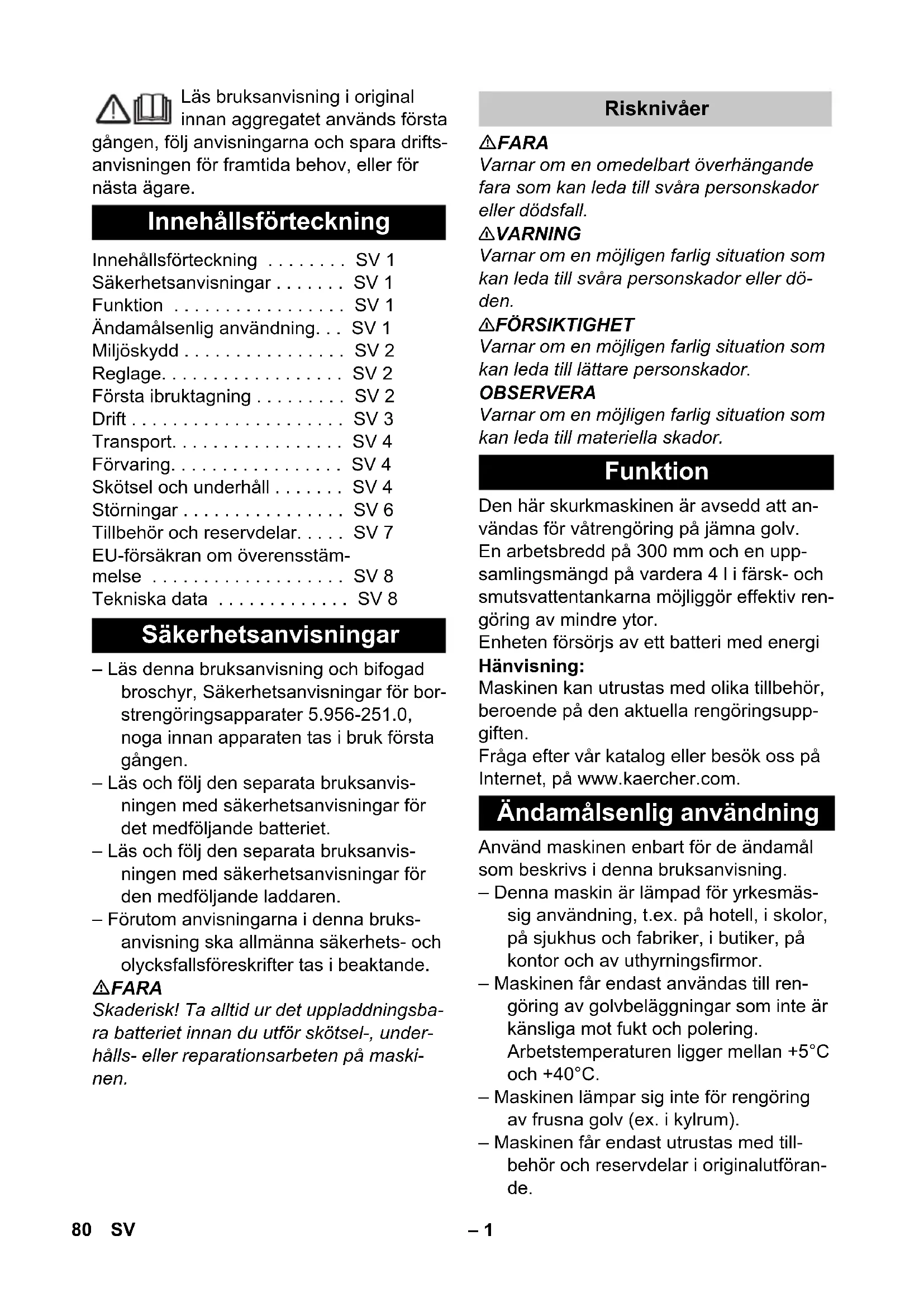 dB(A) 1 79NO– 1 Läs bruksanvisning i original innan aggregatet används första gången, följ anvisningarna och spara drifts- anvisningen för framtida behov, eller för nästa ägare. – Läs denna bruksanvisning och bifogad broschyr, Säkerhetsanvisningar för bor- strengöringsapparater 5.956-251.0, noga innan apparaten tas i bruk första gången. – Läs och följ den separata bruksanvis- ningen med säkerhetsanvisningar för det medföljande batteriet. – Läs och följ den separata bruksanvis- ningen med säkerhetsanvisningar för den medföljande laddaren. – Förutom anvisningarna i denna bruks- anvisning ska allmänna säkerhets- och olycksfallsföreskrifter tas i beaktande. FARA Skaderisk! Ta alltid ur det uppladdningsba- ra batteriet innan du utför skötsel-, under- hålls- eller reparationsarbeten på maski- nen. FARA Varnar om en omedelbart överhängande fara som kan leda till svåra personskador eller dödsfall. 몇 VARNING Varnar om en möjligen farlig situation som kan leda till svåra personskador eller dö- den. 몇 FÖRSIKTIGHET Varnar om en möjligen farlig situation som kan leda till lättare personskador. OBSERVERA Varnar om en möjligen farlig situation som kan leda till materiella skador. Den här skurkmaskinen är avsedd att an- vändas för våtrengöring på jämna golv. En arbetsbredd på 300 mm och en upp- samlingsmängd på vardera 4 l i färsk- och smutsvattentankarna möjliggör effektiv ren- göring av mindre ytor. Enheten försörjs av ett batteri med energi Hänvisning: Maskinen kan utrustas med olika tillbehör, beroende på den aktuella rengöringsupp- giften. Fråga efter vår katalog eller besök oss på Internet, på www.kaercher.com. Använd maskinen enbart för de ändamål som beskrivs i denna bruksanvisning. – Denna maskin är lämpad för yrkesmäs- sig användning, t.ex. på hotell, i skolor, på sjukhus och fabriker, i butiker, på kontor och av uthyrningsfirmor. – Maskinen får endast användas till ren- göring av golvbeläggningar som inte är känsliga mot fukt och polering. Arbetstemperaturen ligger mellan +5°C och +40°C. – Maskinen lämpar sig inte för rengöring av frusna golv (ex. i kylrum). – Maskinen får endast utrustas med till- behör och reservdelar i originalutföran- de. Innehållsförteckning Innehållsförteckning . . . . . . . . SV 1 Säkerhetsanvisningar . . . . . . . SV 1 Funktion . . . . . . . . . . . . . . . . . SV 1 Ändamålsenlig användning. . . SV 1 Miljöskydd . . . . . . . . . . . . . . . . SV 2 Reglage. . . . . . . . . . . . . . . . . . SV 2 Första ibruktagning . . . . . . . . . SV 2 Drift . . . . . . . . . . . . . . . . . . . . . SV 3 Transport. . . . . . . . . . . . . . . . . SV 4 Förvaring. . . . . . . . . . . . . . . . . SV 4 Skötsel och underhåll . . . . . . . SV 4 Störningar . . . . . . . . . . . . . . . . SV 6 Tillbehör och reservdelar. . . . . SV 7 EU-försäkran om överensstäm- melse . . . . . . . . . . . . . . . . . . . SV 8 Tekniska data . . . . . . . . . . . . . SV 8 Säkerhetsanvisningar Risknivåer Funktion Ändamålsenlig användning 80 SV– 2 – Maskinen är konstruerad för rengöring av golv inomhus och ytor under tak. – Maskinen är inte avsedd för rengöring av allmänna vägar. – Maskinen är inte lämplig för användning inom områden med explosionsrisk. Upplysningar om ingredienser (REACH) Aktuell information om ingredienser finns på: www.kaercher.com/REACH Bilder finns på omslagssidan Bild 1 Handtag 2 Reglage vattenpump 3 Tryckknapp borst-/sugdrift 4 Bärhandtag 5 Bygelhandtag smutsvattentank 6 Smutsvattentank 7 Färskvattentank 8 Låsning av färskvattentanken (påfyll- ningsöppning) 9 Uppladdningsbart batteri 10 Batterifack 11 Rengöringshuvud 12 Pedal sugskenehöjning 13 Frikoppling parkeringsposition 14 Batteriindikering Se beskrivning i bruksanvisningen till batteriet 15 Spärr till batteri 16 Upplåsningsknapp, utbytesborste 17 Borstvals 18 Sugskena 19 Skydd smutsvattentank 20 Stäng locket på smutsvattentanken 21 Bränslemätare 22 Batteriladdningsindikator 3 LED-lampor lyser: 100–76 % restka- pacitet 2 LED-lampor lyser: 75–51 % restkapa- citet 1 LED lyser: 50–26 % restkapacitet 1 LED-lampa blinkar: Mindre än 26 % restkapacitet, ladda batteriet 23 Anslutning av sugrör och sugslang 24 Sugrör 25 Sugslang Bild Stick in röret, som sitter i slutet av hand- taget, i maskinen. Tryck på spärren och skjut in handtaget tills det hakar fast i maskinen. Rikta in kabeln i maskinen och sätt fast locket på det sätt som visas på den bi- fogade sidan. Ladda det uppladdningsbara batteriet. Beskrivningen av detta finns i den sepa- rata bruksanvisningen för batteriet och laddaren Bild Sätt i det laddade batteriet i batterihålla- ren, skjut in det så långt det går och klicka på plats. Miljöskydd Emballagematerialen kan åter- vinnas. Kasta inte emballaget i hushållssoporna utan lämna det till återvinning. Förbrukade apparater innehåller delar som kan återvinnas, de bör därför föras till recycling. Batte- rier, engångs och uppladdnings- bara, innehåller ämnen, som inte får komma ut i miljön. Överlämna därför kasserade apparater och batterier till lämpligt återvinnings- system. Elektriska och elektroniska ma- skiner innehåller ofta komponen- ter som vid felaktig användning eller felaktig avfallshantering kan utgöra en potentiell risk för män- niskors hälsa och för miljön. Dessa komponenter är dock nöd- vändiga för att maskinen ska kun- na arbeta korrekt. Maskiner som märkts med denna symbol får inte kastas i hushållssoporna. Reglage Första ibruktagning Lägg i batteri 81SV– 3 몇 FÖRSIKTIGHET Skaderisk. Använd enbart de rekommen- derade rengöringsmedlen. För andra ren- göringsmedel bär den driftsansvarige an- svaret för den ökade risken med avseende på driftsäkerhet, olycksfallsrisk och förkor- tad livslängd för maskinen. Använd bara rengöringsmedel som inte innehåller lös- ningsmedel