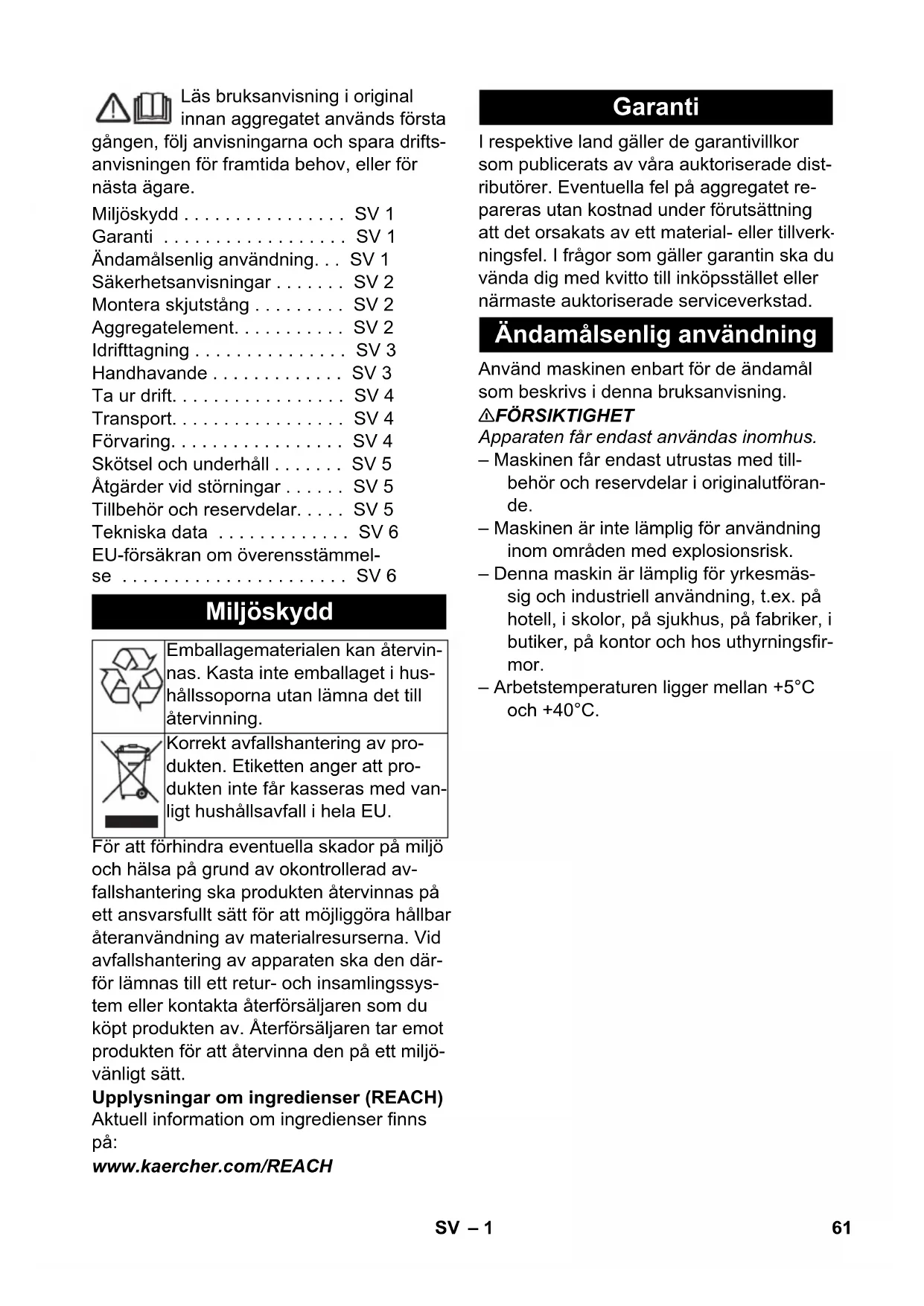 Chairman of the Board of Management Director Regulatory Affairs & Certification 60 NO– 1 Läs bruksanvisning i original innan aggregatet används första gången, följ anvisningarna och spara drifts- anvisningen för framtida behov, eller för nästa ägare. För att förhindra eventuella skador på miljö och hälsa på grund av okontrollerad av- fallshantering ska produkten återvinnas på ett ansvarsfullt sätt för att möjliggöra hållbar återanvändning av materialresurserna. Vid avfallshantering av apparaten ska den där- för lämnas till ett retur- och insamlingssys- tem eller kontakta återförsäljaren som du köpt produkten av. Återförsäljaren tar emot produkten för att återvinna den på ett miljö- vänligt sätt. Upplysningar om ingredienser (REACH) Aktuell information om ingredienser finns på: www.kaercher.com/REACH I respektive land gäller de garantivillkor som publicerats av våra auktoriserade dist- ributörer. Eventuella fel på aggregatet re- pareras utan kostnad under förutsättning att det orsakats av ett material- eller tillverk- ningsfel. I frågor som gäller garantin ska du vända dig med kvitto till inköpsstället eller närmaste auktoriserade serviceverkstad. Använd maskinen enbart för de ändamål som beskrivs i denna bruksanvisning. 몇 FÖRSIKTIGHET Apparaten får endast användas inomhus. – Maskinen får endast utrustas med till- behör och reservdelar i originalutföran- de. – Maskinen är inte lämplig för användning inom områden med explosionsrisk. – Denna maskin är lämplig för yrkesmäs- sig och industriell användning, t.ex. på hotell, i skolor, på sjukhus, på fabriker, i butiker, på kontor och hos uthyrningsfir- mor. – Arbetstemperaturen ligger mellan +5°C och +40°C. Miljöskydd . . . . . . . . . . . . . . . . SV 1 Garanti . . . . . . . . . . . . . . . . . . SV 1 Ändamålsenlig användning. . . SV 1 Säkerhetsanvisningar . . . . . . . SV 2 Montera skjutstång . . . . . . . . . SV 2 Aggregatelement. . . . . . . . . . . SV 2 Idrifttagning . . . . . . . . . . . . . . . SV 3 Handhavande . . . . . . . . . . . . . SV 3 Ta ur drift. . . . . . . . . . . . . . . . . SV 4 Transport. . . . . . . . . . . . . . . . . SV 4 Förvaring. . . . . . . . . . . . . . . . . SV 4 Skötsel och underhåll . . . . . . . SV 5 Åtgärder vid störningar . . . . . . SV 5 Tillbehör och reservdelar. . . . . SV 5 Tekniska data . . . . . . . . . . . . . SV 6 EU-försäkran om överensstämmel- se . . . . . . . . . . . . . . . . . . . . . . SV 6 Miljöskydd Emballagematerialen kan återvin- nas. Kasta inte emballaget i hus- hållssoporna utan lämna det till återvinning. Korrekt avfallshantering av pro- dukten. Etiketten anger att pro- dukten inte får kasseras med van- ligt hushållsavfall i hela EU. Garanti Ändamålsenlig användning 61SV– 2 Läs noga denna bruksanvisning och bifo- gade broschyr, Säkerhetsanvisningar för våt/torrsug nr. 5.956-659, innan maskinen tas i bruk första gången. FARA Varnar om en omedelbart överhängande fara som kan leda till svåra personskador eller dödsfall. 몇 VARNING Varnar om en möjligen farlig situation som kan leda till svåra personskador eller dö- den. 몇 FÖRSIKTIGHET Varnar om en möjligen farlig situation som kan leda till lättare personskador. OBSERVERA Varnar om en möjligen farlig situation som kan leda till materiella skador. Säkerhetsanordningarna ger skydd åt an- vändaren och får varken sättas ur drift eller förbikopplas. Förhindrar att apparaten slås på oavsiktligt. Tryck först på upplåsningsknappen och se- dan på AV/PÅ-knappen för att slå på appa- raten. Innan maskinen tas i drift måste skjutstång- en monteras på det sätt som visas och den elektriska anslutningen till maskinen göras. Bild, se på omslagssidan På bilden visas apparaten BDS 43/150 C Classic. Apparaten BDS 43/Duo C avviker endast minimalt. 1 Gripare, skivborste/pad-drivtallrik 2 Borste/dyndrivtallrik 3 Doserinksspak till rengöringsmedels- lösning (tillval) 4 Strömbrytare PÅ/AV 5 Kabelkrok 6 Avreglingsknapp 7 Handtag 8 Spak för inställning av vinkel 9 Säkring borstdrivning 10 Eluttag för tillbehör 11 Rengöringsmedelstank (tillval) 12 Motorkåpa 13 Omkopplare för borstvarvtal (endast BDS 43/Duo C) ** medföljer ej Säkerhetsanvisningar Risknivåer Säkerhetsanordningar Låsning Montera skjutstång Aggregatelement