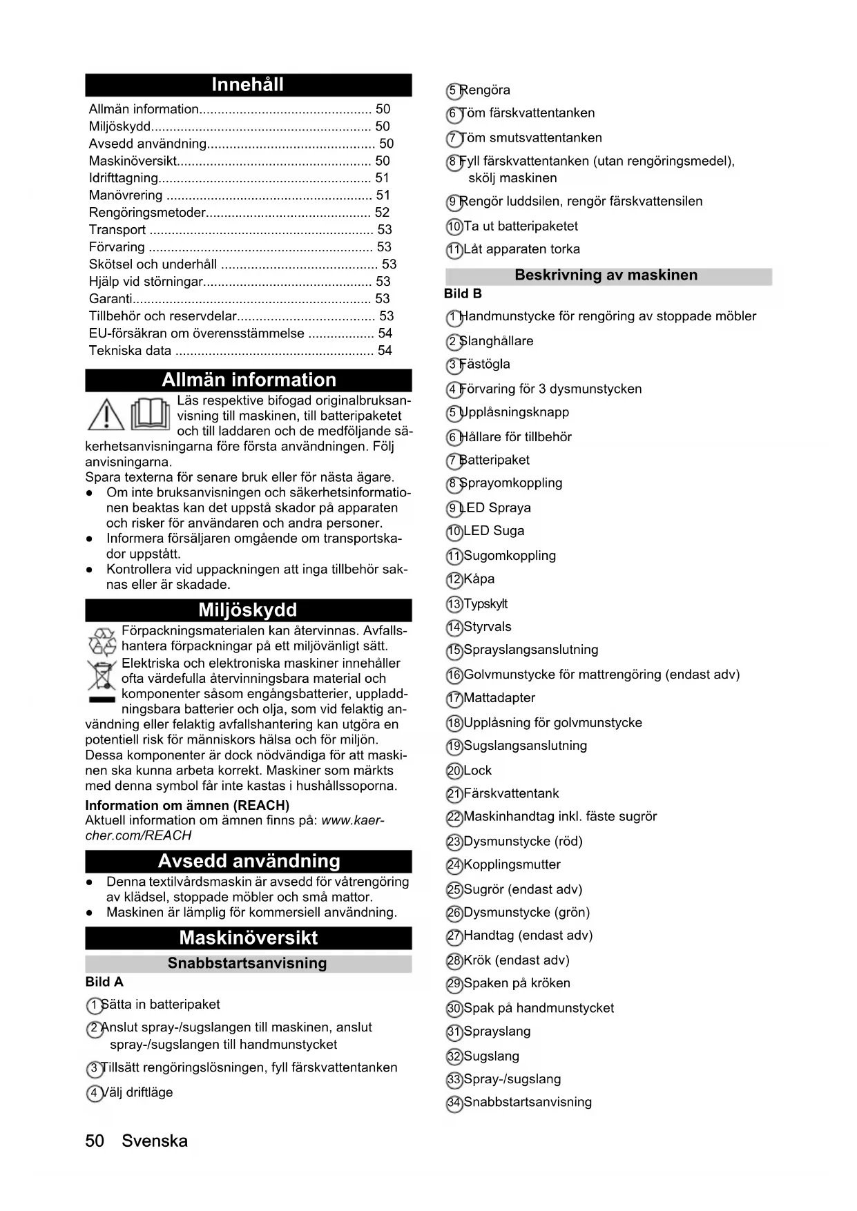 - 0,250 Svenska Innehåll Allmän information Läs respektive bifogad originalbruksan- visning till maskinen, till batteripaketet och till laddaren och de medföljande sä- kerhetsanvisningarna före första användningen. Följ anvisningarna. Spara texterna för senare bruk eller för nästa ägare. ● Om inte bruksanvisningen och säkerhetsinformatio- nen beaktas kan det uppstå skador på apparaten och risker för användaren och andra personer. ● Informera försäljaren omgående om transportska- dor uppstått. ● Kontrollera vid uppackningen att inga tillbehör sak- nas eller är skadade. Miljöskydd Förpackningsmaterialen kan återvinnas. Avfalls- hantera förpackningar på ett miljövänligt sätt. Elektriska och elektroniska maskiner innehåller ofta värdefulla återvinningsbara material och komponenter såsom engångsbatterier, uppladd- ningsbara batterier och olja, som vid felaktig an- vändning eller felaktig avfallshantering kan utgöra en potentiell risk för människors hälsa och för miljön. Dessa komponenter är dock nödvändiga för att maski- nen ska kunna arbeta korrekt. Maskiner som märkts med denna symbol får inte kastas i hushållssoporna. Information om ämnen (REACH) Aktuell information om ämnen finns på: www.kaer- cher.com/REACH Avsedd användning ● Denna textilvårdsmaskin är avsedd för våtrengöring av klädsel, stoppade möbler och små mattor. ● Maskinen är lämplig för kommersiell användning. Maskinöversikt Snabbstartsanvisning Bild A 1 Sätta in batteripaket 2 Anslut spray-/sugslangen till maskinen, anslut spray-/sugslangen till handmunstycket 3 Tillsätt rengöringslösningen, fyll färskvattentanken 4 Välj driftläge 5 Rengöra 6 Töm färskvattentanken 7 Töm smutsvattentanken 8 Fyll färskvattentanken (utan rengöringsmedel), skölj maskinen 9 Rengör luddsilen, rengör färskvattensilen 10 Ta ut batteripaketet 11 Låt apparaten torka Beskrivning av maskinen Bild B 1 Handmunstycke för rengöring av stoppade möbler 2 Slanghållare 3 Fästögla 4 Förvaring för 3 dysmunstycken 5 Upplåsningsknapp 6 Hållare för tillbehör 7 Batteripaket 8 Sprayomkoppling 9 LED Spraya 10 LED Suga 11 Sugomkoppling 12 Kåpa 13 Typskylt 14 Styrvals 15 Sprayslangsanslutning 16 Golvmunstycke för mattrengöring (endast adv) 17 Mattadapter 18 Upplåsning för golvmunstycke 19 Sugslangsanslutning 20 Lock 21 Färskvattentank 22 Maskinhandtag inkl. fäste sugrör 23 Dysmunstycke (röd) 24 Kopplingsmutter 25 Sugrör (endast adv) 26 Dysmunstycke (grön) 27 Handtag (endast adv) 28 Krök (endast adv) 29 Spaken på kröken 30 Spak på handmunstycket 31 Sprayslang 32 Sugslang 33 Spray-/sugslang 34 Snabbstartsanvisning Allmän information p. 50