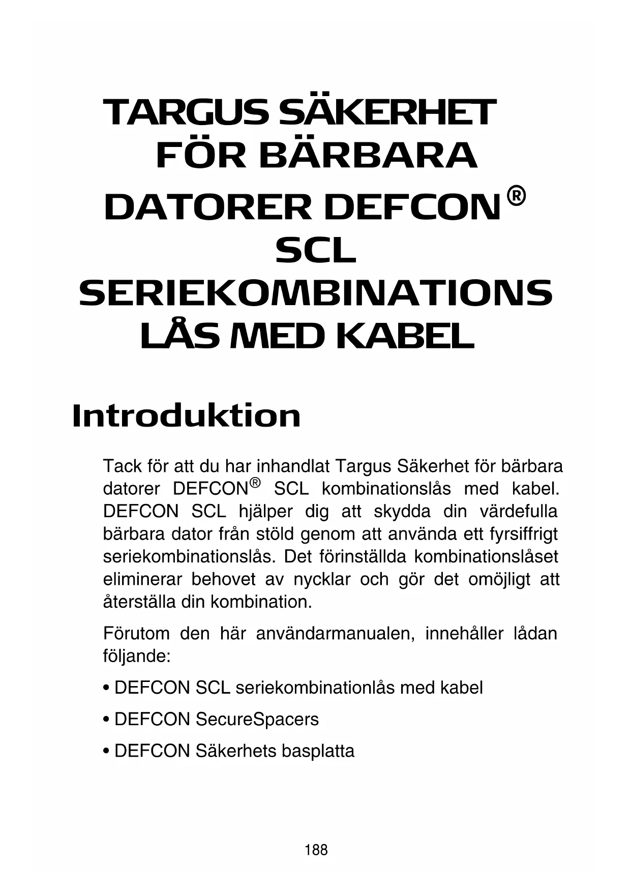 - DEFCON Säkerhets basplatta189 TARGUS SÄKERHET FÖR BÄRBARA DATORER DEFCON® SCL SERIEKOMBINATIONSLÅS MED KABEL VARNING: FÖR ATT KUNNA ANVÄNDA DEFCON SCL MÅSTE DU REGISTRERA DEN FÖRINSTÄLLDA KOMBINATIONEN INNAN ANVÄNDNING. Seriekombination 1 Placera kombinationsväljarna och fönster på låset. DEFCON SCL 2 Den förinställda kombinationen framträder på en klisterlapp som är fäst på baksidan av den här användarmanualen.