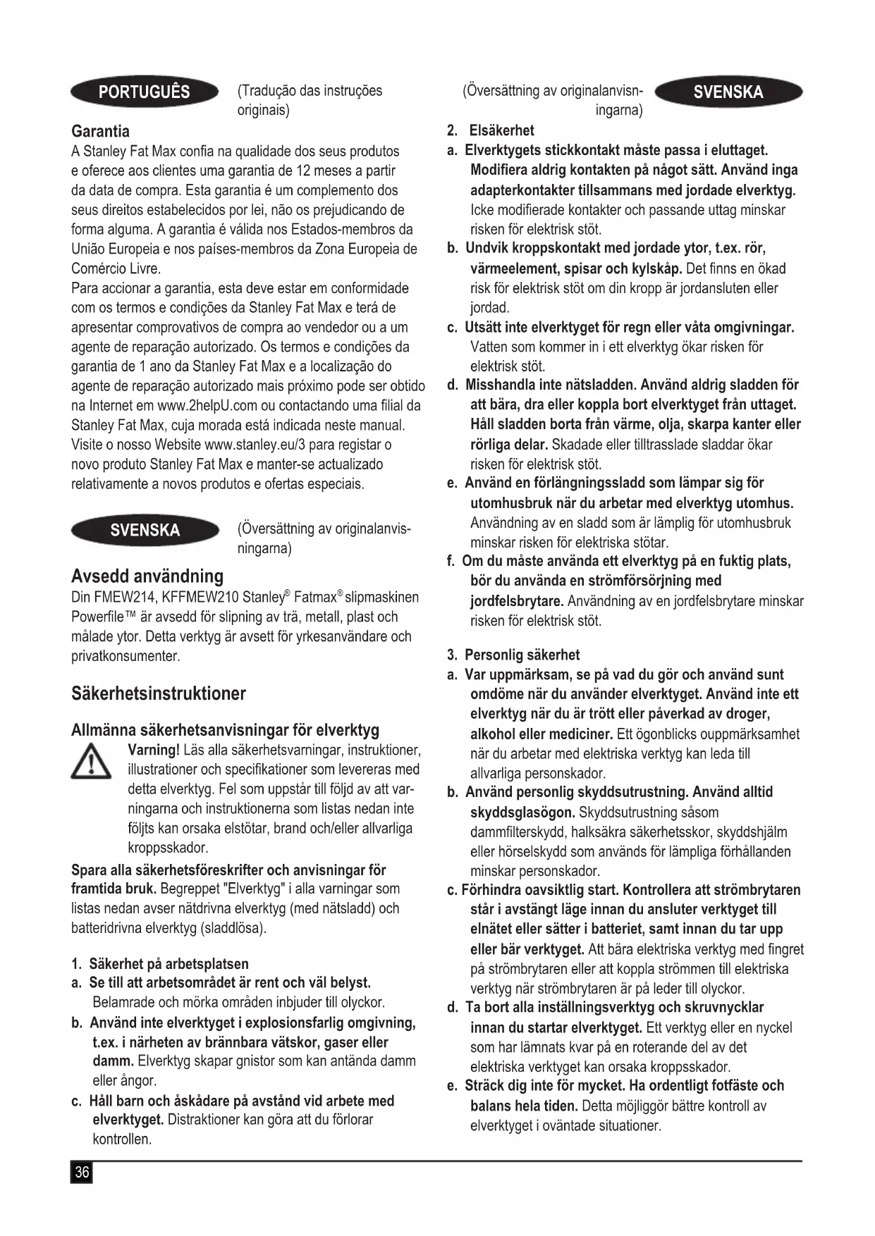slipmaskinen Powerle™ är avsedd för slipning av trä, metall, plast och målade ytor. Detta verktyg är avsett för yrkesanvändare och privatkonsumenter. Säkerhetsinstruktioner Allmänna säkerhetsanvisningar för elverktyg Varning! Läs alla säkerhetsvarningar, instruktioner, illustrationer och specikationer som levereras med detta elverktyg. Fel som uppstår till följd av att var- ningarna och instruktionerna som listas nedan inte följts kan orsaka elstötar, brand och/eller allvarliga kroppsskador. Spara alla säkerhetsföreskrifter och anvisningar för framtida bruk. Begreppet "Elverktyg" i alla varningar som listas nedan avser nätdrivna elverktyg (med nätsladd) och batteridrivna elverktyg (sladdlösa).