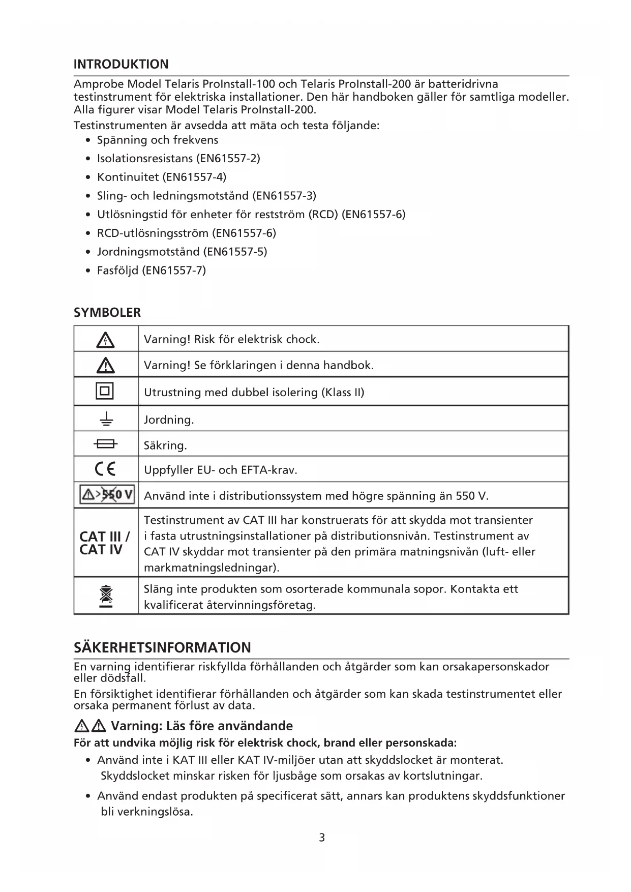 INTRODUKTIONAmprobe Model Telaris ProInstall-100 och Telaris ProInstall-200 är batteridrivna testinstrument för elektriska installationer. Den här handboken gäller för samtliga modeller. Alla figurer visar Model Telaris ProInstall-200.Testinstrumenten är avsedda att mäta och testa följande:• Spänning och frekvens• Isolationsresistans (EN61557-2)• Kontinuitet (EN61557-4)• Sling- och ledningsmotstånd (EN61557-3)• Utlösningstid för enheter för restström (RCD) (EN61557-6)• RCD-utlösningsström (EN61557-6)• Jordningsmotstånd (EN61557-5)• Fasföljd (EN61557-7)SYMBOLER Varning! Risk för elektrisk chock. Varning! Se förklaringen i denna handbok. Utrustning med dubbel isolering (Klass II) Jordning. Säkring. Uppfyller EU- och EFTA-krav.Använd inte i distributionssystem med högre spänning än 550 V.CAT III / CAT IVTestinstrument av CAT III har konstruerats för att skydda mot transienter i fasta utrustningsinstallationer på distributionsnivån. Testinstrument av CAT IV skyddar mot transienter på den primära matningsnivån (luft- eller markmatningsledningar). Släng inte produkten som osorterade kommunala sopor. Kontakta ett kvalificerat återvinningsföretag. SÄKERHETSINFORMATION En varning identifierar riskfyllda förhållanden och åtgärder som kan orsakapersonskador eller dödsfall.En försiktighet identifierar förhållanden och åtgärder som kan skada testinstrumentet eller orsaka permanent förlust av data. W Varning: Läs före användande För att undvika möjlig risk för elektrisk chock, brand eller personskada:• Använd inte i KAT III eller KAT IV-miljöer utan att skyddslocket är monterat. Skyddslocket minskar risken för ljusbåge som orsakas av kortslutningar.• Använd endast produkten på specificerat sätt, annars kan produktens skyddsfunktioner bli verkningslösa.4