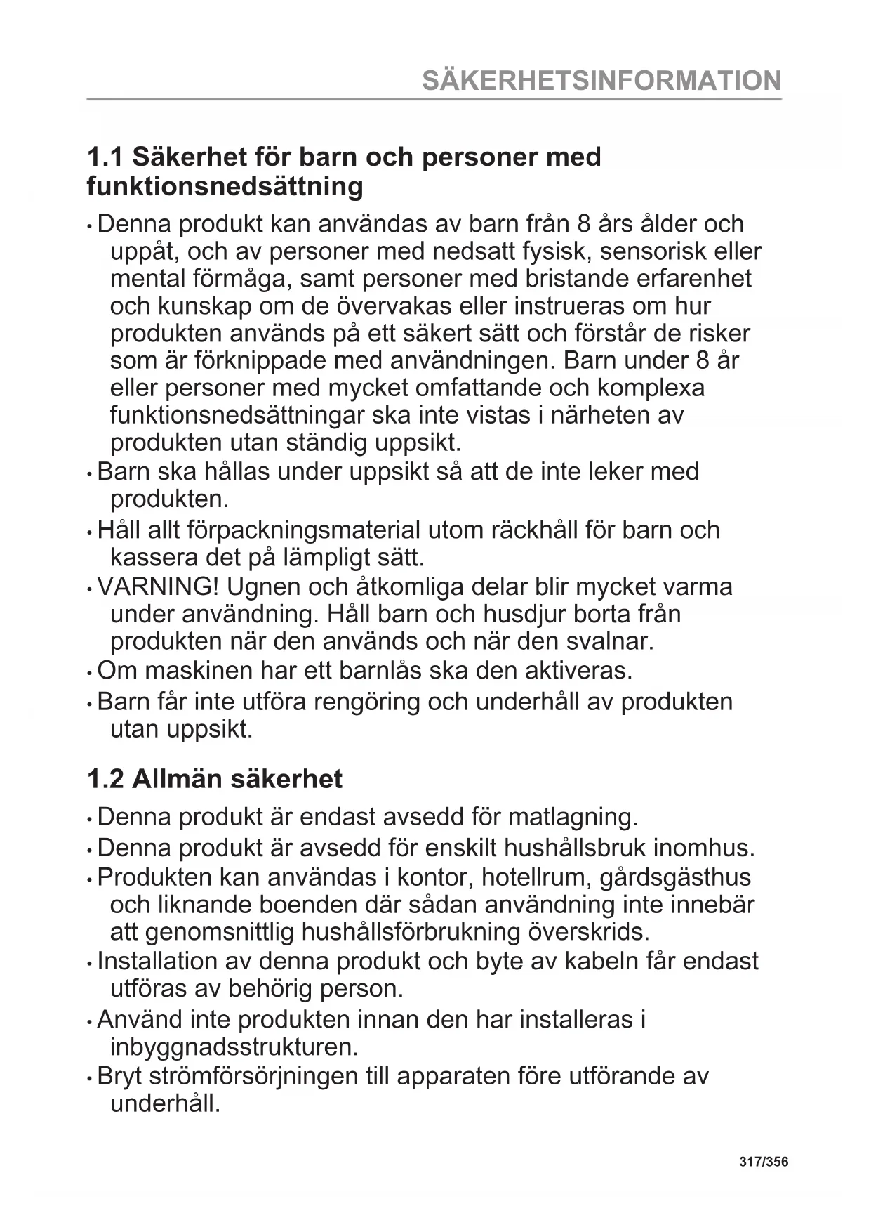 Läs noga de bifogade instruktionerna före installation och användning av produkten. Tillverkaren är inte ansvarig för eventuella personskador eller andra skador som uppkommit som ett resultat av felaktig installation eller användning. Förvara alltid bruksanvisningen på en säker och tillgänglig plats för framtida bruk. 316/356 SÄKERHETSINFORMATION1.1 Säkerhet för barn och personer med funktionsnedsättning