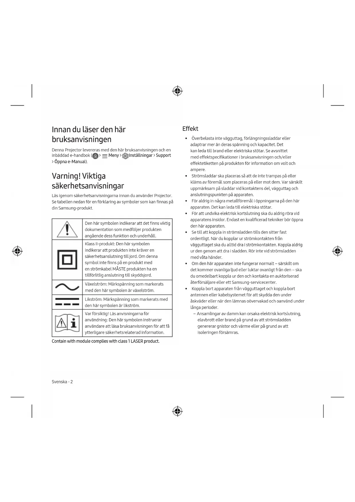 - Dependendo do modelo ou da área geográfica onde se encontra, estas licenças poderão não ser suportadas. The terms HDMI and HDMI High-Definition Multimedia Interface, and the HDMI Logo are trademarks or registered trademarks of HDMI Licensing Administrator, Inc. in the United States and other countries.Esta página foi deixada em branco intencionalmente.Svenska - 2 Innan du läser den här bruksanvisningen Denna Projector levereras med den här bruksanvisningen och en inbäddad e-handbok ( > Meny > Inställningar > Support > Öppna e-Manual). Varning! Viktiga säkerhetsanvisningar Läs igenom säkerhetsanvisningarna innan du använder Projector. Se tabellen nedan för en förklaring av symboler som kan finnas på din Samsung-produkt. Den här symbolen indikerar att det finns viktig dokumentation som medföljer produkten angående dess funktion och underhåll. Klass II-produkt: Den här symbolen indikerar att produkten inte kräver en säkerhetsanslutning till jord. Om denna symbol inte finns på en produkt med en strömkabel MÅSTE produkten ha en tillförlitlig anslutning till skyddsjord. Växelström: Märkspänning som markerats med den här symbolen är växelström. Likström: Märkspänning som markerats med den här symbolen är likström. Var försiktig! Läs anvisningarna för användning: Den här symbolen instruerar användare att läsa bruksanvisningen för att få ytterligare säkerhetsrelaterad information. Contain with module complies with class 1 LASER product. Effekt