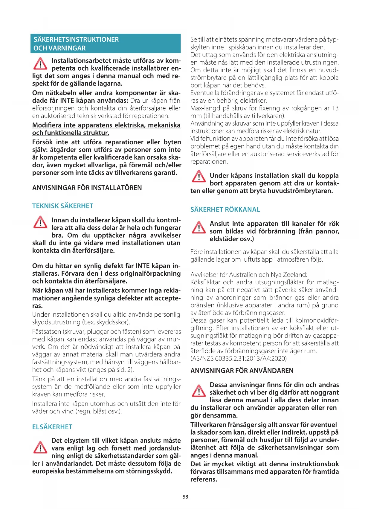 Anslut inte apparaten till kanaler för rök som bildas vid förbränning (från pannor, eldstäder osv.) Före installationen av kåpan skall du säkerställa att alla gällande lagar om luftutsläpp i atmosfären följs. Avvikelser för Australien och Nya Zeeland: Köksäktar och andra utsugningsäktar för matlag- ning kan på ett negativt sätt påverka säker använd- ning av anordningar som bränner gas eller andra bränslen (inklusive apparater i andra rum) på grund av återöde av förbränningsgaser. Dessa gaser kan potentiellt leda till kolmonoxidför- giftning. Efter installationen av en köksäkt eller ut- sugningsäkt för matlagning bör driften av gasappa- rater testas av kompetent person för att säkerställa att återöde av förbränningsgaser inte äger rum. (AS/NZS 60335.2.31:2013/A4:2020)