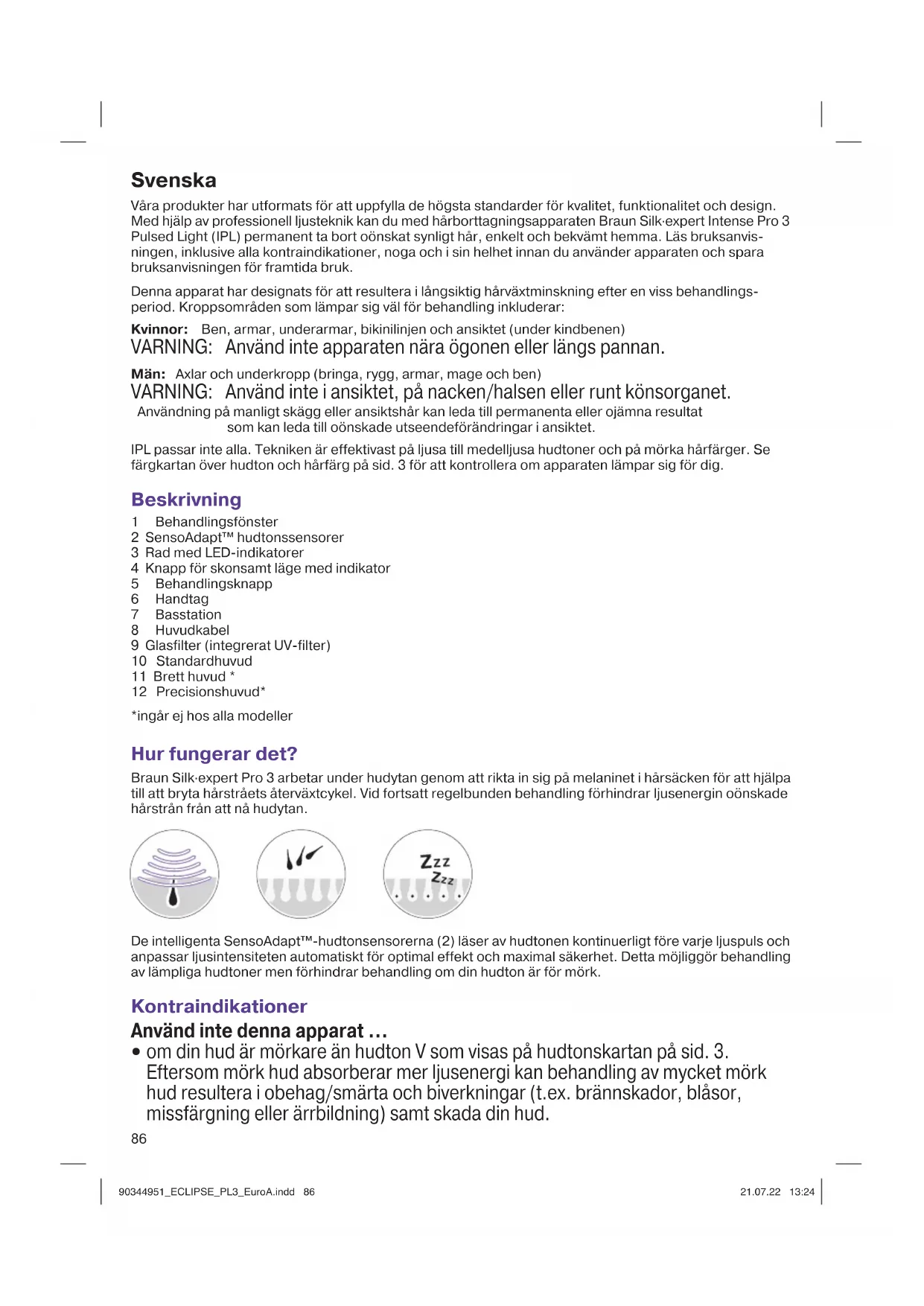For varer kjøpt i Norge har kunden garanti i henhold til NELs leveringsbetingelser. 90344951_ECLIPSE_PL3_EuroA.indd 8590344951_ECLIPSE_PL3_EuroA.indd 85 21.07.22 13:2421.07.22 13:2486 Svenska Våra produkter har utformats för att uppfylla de högsta standarder för kvalitet, funktionalitet och design. Med hjälp av professionell ljusteknik kan du med hårborttagningsapparaten Braun Silk·expert Intense Pro 3 Pulsed Light (IPL) permanent ta bort oönskat synligt hår, enkelt och bekvämt hemma. Läs bruksanvis- ningen, inklusive alla kontraindikationer, noga och i sin helhet innan du använder apparaten och spara bruksanvisningen för framtida bruk. Denna apparat har designats för att resultera i långsiktig hårväxtminskning efter en viss behandlings- period. Kroppsområden som lämpar sig väl för behandling inkluderar: Kvinnor: Ben, armar, underarmar, bikinilinjen och ansiktet (under kindbenen) VARNING: Använd inte apparaten nära ögonen eller längs pannan. Män: Axlar och underkropp (bringa, rygg, armar, mage och ben) VARNING: Använd inte i ansiktet, på nacken/halsen eller runt könsorganet. Användning på manligt skägg eller ansiktshår kan leda till permanenta eller ojämna resultat som kan leda till oönskade utseendeförändringar i ansiktet. IPL passar inte alla. Tekniken är effektivast på ljusa till medelljusa hudtoner och på mörka hårfärger. Se färgkartan över hudton och hårfärg på sid. 3 för att kontrollera om apparaten lämpar sig för dig. Beskrivning 1 Behandlingsfönster 2 SensoAdapt™ hudtonssensorer 3 Rad med LED-indikatorer 4 Knapp för skonsamt läge med indikator 5 Behandlingsknapp 6 Handtag 7 Basstation 8 Huvudkabel 9 Glasfilter (integrerat UV-filter) 10 Standardhuvud 11 Brett huvud * 12 Precisionshuvud* *ingår ej hos alla modeller Hur fungerar det? Braun Silk·expert Pro 3 arbetar under hudytan genom att rikta in sig på melaninet i hårsäcken för att hjälpa till att bryta hårstråets återväxtcykel. Vid fortsatt regelbunden behandling förhindrar ljusenergin oönskade hårstrån från att nå hudytan. De intelligenta SensoAdapt™-hudtonsensorerna (2) läser av hudtonen kontinuerligt före varje ljuspuls och anpassar ljusintensiteten automatiskt för optimal effekt och maximal säkerhet. Detta möjliggör behandling av lämpliga hudtoner men förhindrar behandling om din hudton är för mörk. Kontraindikationer Använd inte denna apparat ...