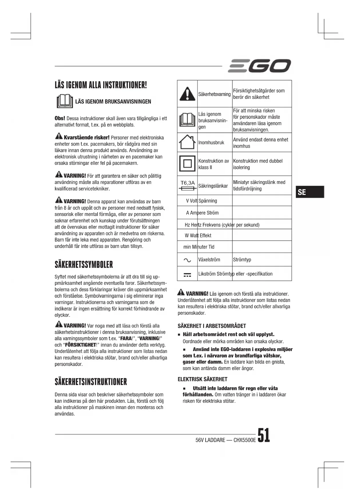 - Spara dessa instruktioner. Bruksanvisingen innehaller viktiga instruktioner om sakerhet och användning av EGO 56V snabbladdare CHX5500E.