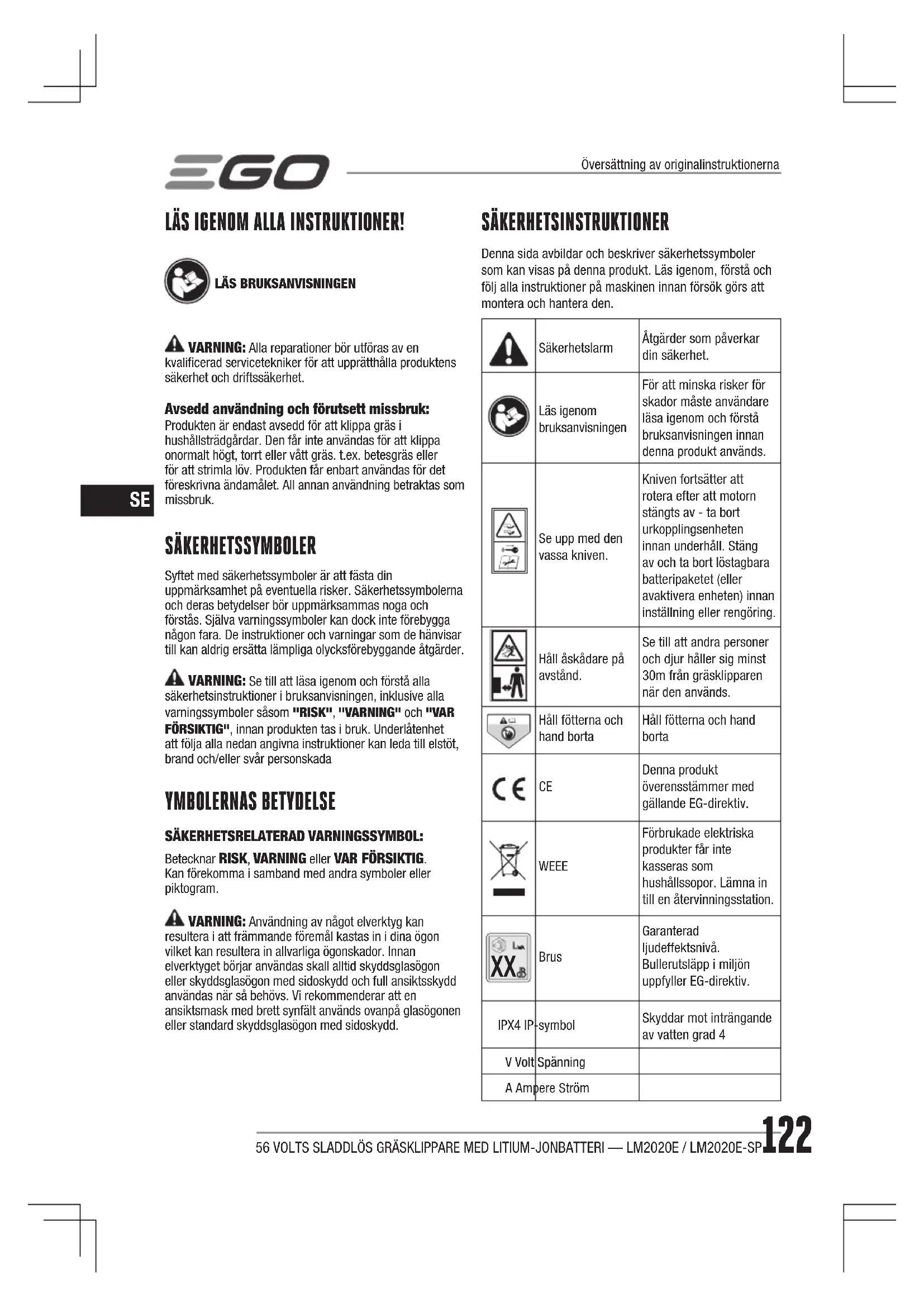 Brus Garanterad ljudeffektsnivå. Bullerutsläpp i miljön uppfyller EG-direktiv.IPX4 IP-symbolSkyddar mot inträngande av vatten grad 4V Volt SpänningA Ampere StrömÖversättning av originalinstruktionerna56 VOLTS SLADDLÖS GRÄSKLIPPARE MED LITIUM-JONBATTERI — LM2020E / LM2020E-SP 123