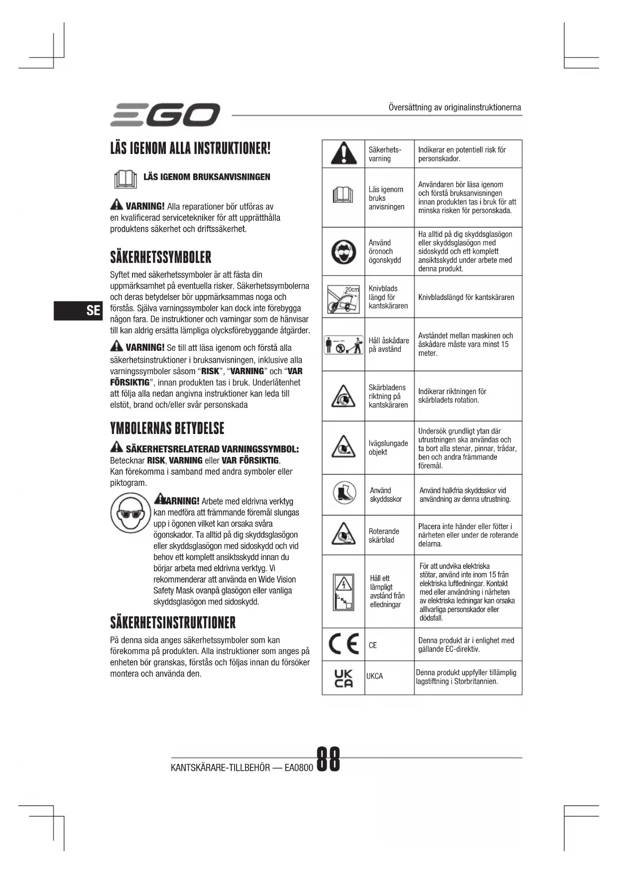 VARNING! Alla reparationer bör utföras av en kvalicerad servicetekniker för att upprätthålla produktens säkerhet och driftssäkerhet. SÄKERHETSSYMBOLER Syftet med säkerhetssymboler är att fästa din uppmärksamhet på eventuella risker. Säkerhetssymbolerna och deras betydelser bör uppmärksammas noga och förstås. Själva varningssymboler kan dock inte förebygga någon fara. De instruktioner och varningar som de hänvisar till kan aldrig ersätta lämpliga olycksförebyggande åtgärder. VARNING! Se till att läsa igenom och förstå alla säkerhetsinstruktioner i bruksanvisningen, inklusive alla varningssymboler såsom “RISK”, “VARNING” och “VAR FÖRSIKTIG”, innan produkten tas i bruk. Underlåtenhet att följa alla nedan angivna instruktioner kan leda till elstöt, brand och/eller svår personskada YMBOLERNAS BETYDELSE SÄKERHETSRELATERAD VARNINGSSYMBOL: Betecknar RISK, VARNING eller VAR FÖRSIKTIG. Kan förekomma i samband med andra symboler eller piktogram. VARNING! Arbete med eldrivna verktyg kan medföra att främmande föremål slungas upp i ögonen vilket kan orsaka svåra ögonskador. Ta alltid på dig skyddsglasögon eller skyddsglasögon med sidoskydd och vid behov ett komplett ansiktsskydd innan du börjar arbeta med eldrivna verktyg. Vi rekommenderar att använda en Wide Vision Safety Mask ovanpå glasögon eller vanliga skyddsglasögon med sidoskydd. SÄKERHETSINSTRUKTIONER På denna sida anges säkerhetssymboler som kan förekomma på produkten. Alla instruktioner som anges på enheten bör granskas, förstås och följas innan du försöker montera och använda den. Säkerhets-varningIndikerar en potentiell risk för personskador.Läs igenom bruks anvisningenAnvändaren bör läsa igenom och förstå bruksanvisningen innan produkten tas i bruk för att minska risken för personskada.Använd öronoch ögonskyddHa alltid på dig skyddsglasögon eller skyddsglasögon med sidoskydd och ett komplett ansiktsskydd under arbete med denna produkt. 20cm Knivblads längd för kantskärarenKnivbladslängd för kantskäraren 15m Håll åskådare på avståndAvståndet mellan maskinen och åskådare måste vara minst 15 meter.Skärbladens riktning på kantskärarenIndikerar riktningen för skärbladets rotation.Ivägslungade objektUndersök grundligt ytan där utrustningen ska användas och ta bort alla stenar, pinnar, trådar, ben och andra främmande föremål.Använd skyddsskorAnvänd halkfria skyddsskor vid användning av denna utrustning.Roterande skärbladPlacera inte händer eller fötter i närheten eller under de roterande delarna.Håll ett lämpligt avstånd från elledningarFör att undvika elektriska stötar, använd inte inom 15 från elektriska luftledningar. Kontakt med eller användning i närheten av elektriska ledningar kan orsaka alllvarliga personskador eller dödsfall. Denna produkt är i enlighet med gällande EC-direktiv. UKCA Denna produkt uppfyller tillämplig lagstiftning i Storbritannien. Översättning av originalinstruktionernaKANTSKÄRARE-TILLBEHÖR — EA0800 89