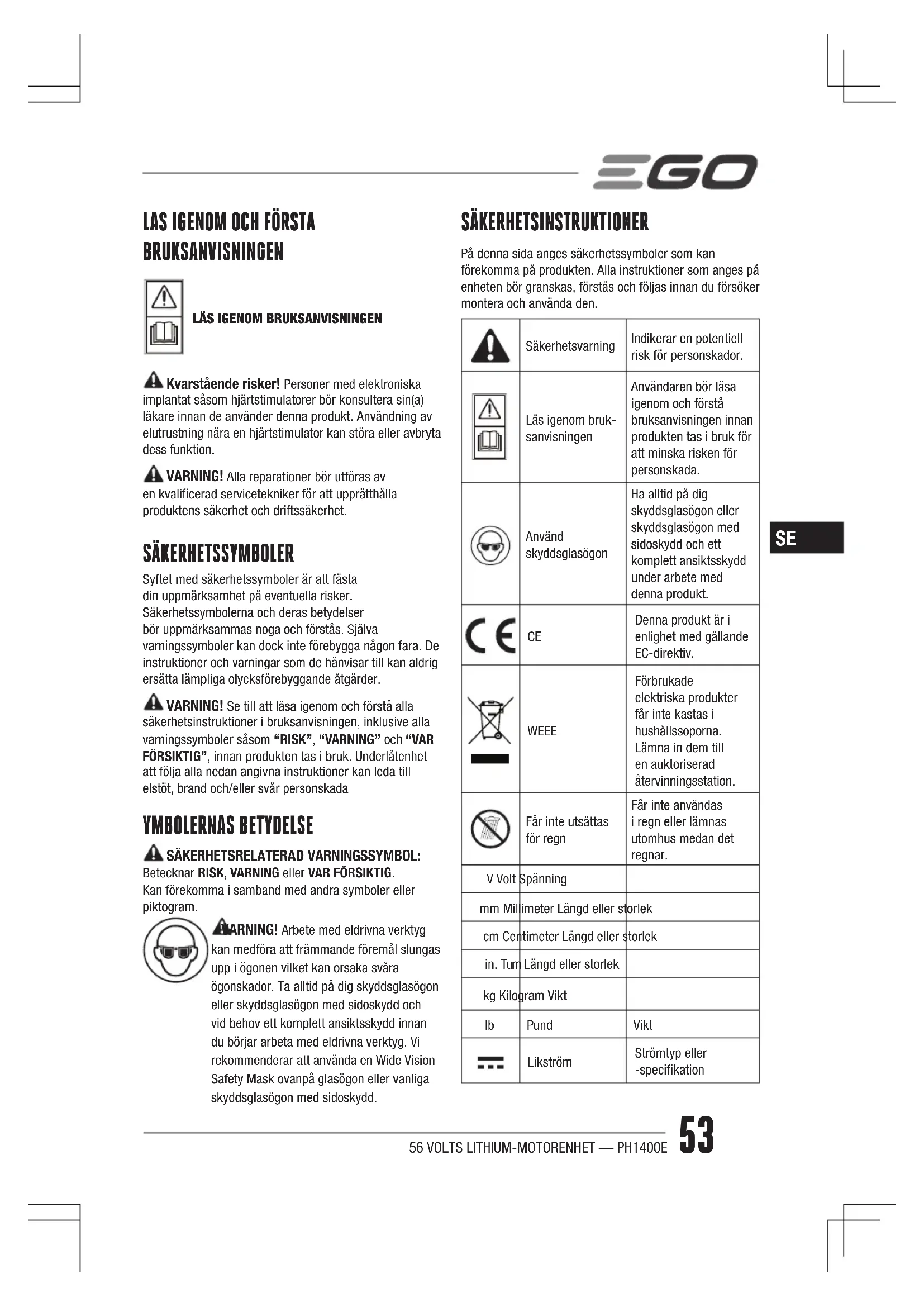 Denna produkt är i enlighet med gällande EC-direktiv. WEEE Förbrukade elektriska produkter får inte kastas i hushållssoporna. Lämna in dem till en auktoriserad återvinningsstation. Får inte utsättas för regn Får inte användas i regn eller lämnas utomhus medan det regnar. V Volt Spänning mm Millimeter Längd eller storlek cm Centimeter Längd eller storlek in. Tum Längd eller storlek kg Kilogram Vikt lb Pund Vikt Likström Strömtyp eller -specifikation56 VOLTS LITHIUM-MOTORENHET — PH1400E 54