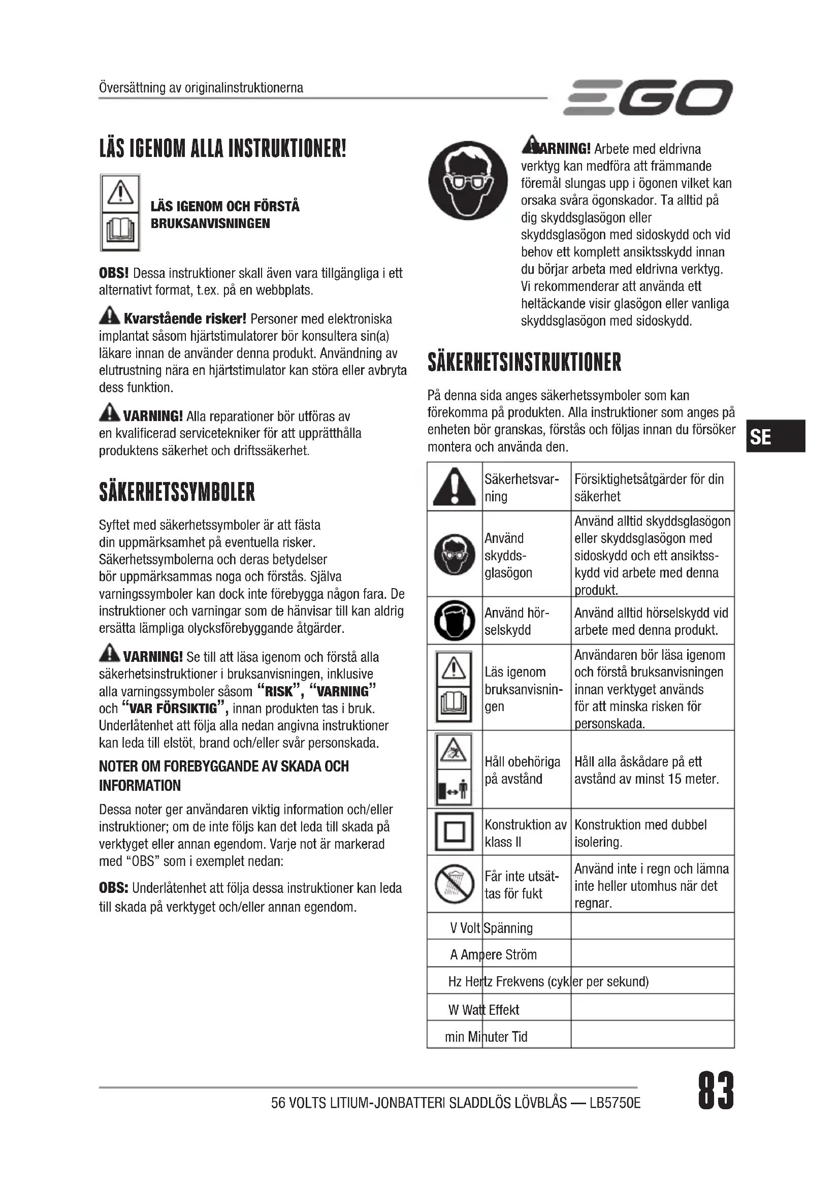 INFORMATION Dessa noter ger användaren viktig information och/eller instruktioner; om de inte följs kan det leda till skada på verktyget eller annan egendom. Varje not är markerad med “OBS” som i exemplet nedan: OBS: Underlåtenhet att följa dessa instruktioner kan leda till skada på verktyget och/eller annan egendom. VARNING! Arbete med eldrivna verktyg kan medföra att främmande föremål slungas upp i ögonen vilket kan orsaka svåra ögonskador. Ta alltid på dig skyddsglasögon eller skyddsglasögon med sidoskydd och vid behov ett komplett ansiktsskydd innan du börjar arbeta med eldrivna verktyg. Vi rekommenderar att använda ett heltäckande visir glasögon eller vanliga skyddsglasögon med sidoskydd. SÄKERHETSINSTRUKTIONER På denna sida anges säkerhetssymboler som kan förekomma på produkten. Alla instruktioner som anges på enheten bör granskas, förstås och följas innan du försöker montera och använda den.Säkerhetsvar- ning Försiktighetsåtgärder för din säkerhetAnvänd skydds-glasögonAnvänd alltid skyddsglasögon eller skyddsglasögon med sidoskydd och ett ansiktss-kydd vid arbete med denna produkt.Använd hör-selskyddAnvänd alltid hörselskydd vid arbete med denna produkt.Läs igenom bruksanvisnin- gen Användaren bör läsa igenom och förstå bruksanvisningen innan verktyget används för att minska risken för personskada.Håll obehöriga på avståndHåll alla åskådare på ett avstånd av minst 15 meter.Konstruktion av klass IIKonstruktion med dubbel isolering.Får inte utsät-tas för fuktAnvänd inte i regn och lämna inte heller utomhus när det regnar.V Volt SpänningA Ampere StrömHz Hertz Frekvens (cykler per sekund)W Watt Effektmin Minuter TidÖversättning av originalinstruktionerna56 VOLTS LITIUM-JONBATTERI SLADDLÖS LÖVBLÅS — LB5750E84