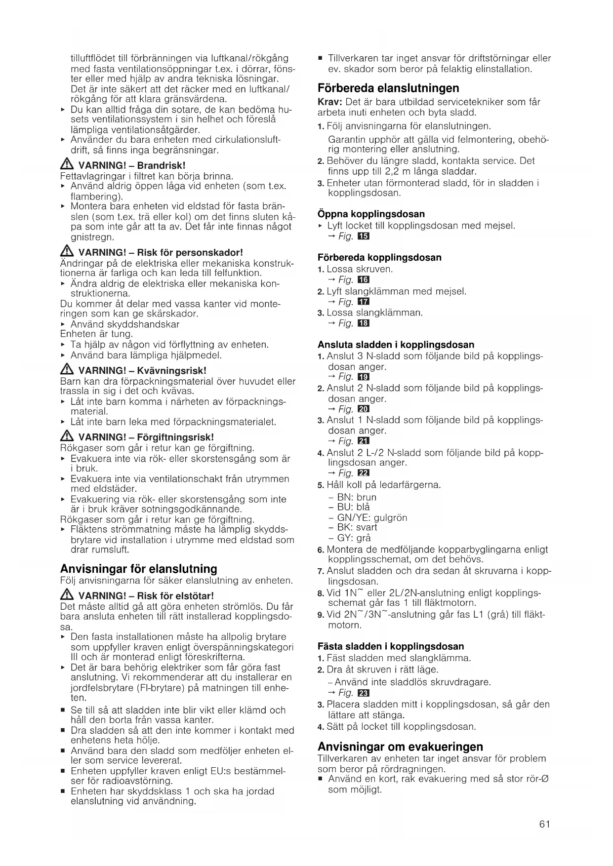 Allmänna anvisningar ¡ Läs igenom anvisningen noga. ¡ Det är bara behörig elektriker som får an- sluta enheten. ¡ Slå alltid av elen innan du utför sådana ar- beten. ¡ Använd aldrig enheten i båtar eller fartyg. ¡ Följ bänkskivtillverkarens rekommendatio- ner. Säker montering Följ säkerhetsanvisningarna när du monterar enhe- ten. Säker användning av enheten kräver fackmässig montering enligt monteringsanvisningen. Installatören ansvarar för en felfri funktion på uppställningsplat- sen. VARNING!‒Fara! Magnetism! Enheten innehåller permanentmagneter. De kan på- verka elektroniska implantat, t.ex. pacemaker och in- sulinpumpar. ▶ Personer med elektroniska implantat måste hålla 10cm:s minimiavstånd till enheten. VARNING!‒Förgiftningsrisk! Rökgaser som går i retur kan ge förgiftning. Värme- källor som förbrukar rumsluft (t.ex. gas-, olje-, ved- el- ler koleldade värmare, flödesvärmare, varmvattenbe- redare) tar förbränningsluft från utrymmet där enhe- ten är installerad och leder ut rökgaserna utomhus via kanaler (t.ex. skorsten). Om köksfläkten är på, så suger den rumsluft från kök och intilliggande rum. Räcker inte ventilationen till, så blir det undertryck. Det får giftgaser från skorsten eller rökgång att gå i retur till boendeutrymmena. ▶ Se till så att det finns tillräcklig ventilation om du använder både enhet med evakuering och eldstad som drar rumsluft. ▶ Säker användning kräver att undertrycket i rummet där värmekällan står underskrider 4 Pa (0,04 mbar). Det kan du uppnå genom att komplettera61 tilluftflödet till förbränningen via luftkanal/rökgång med fasta ventilationsöppningar t.ex. i dörrar, föns- ter eller med hjälp av andra tekniska lösningar. Det är inte säkert att det räcker med en luftkanal/ rökgång för att klara gränsvärdena. ▶ Du kan alltid fråga din sotare, de kan bedöma hu- sets ventilationssystem i sin helhet och föreslå lämpliga ventilationsåtgärder. ▶ Använder du bara enheten med cirkulationsluft- drift, så finns inga begränsningar. VARNING!‒Brandrisk! Fettavlagringar i filtret kan börja brinna. ▶ Använd aldrig öppen låga vid enheten (som t.ex. flambering). ▶ Montera bara enheten vid eldstad för fasta brän- slen (som t.ex. trä eller kol) om det finns sluten kå- pa som inte går att ta av. Det får inte finnas något gnistregn. VARNING!‒Risk för personskador! Ändringar på de elektriska eller mekaniska konstruk- tionerna är farliga och kan leda till felfunktion. ▶ Ändra aldrig de elektriska eller mekaniska kon- struktionerna. Du kommer åt delar med vassa kanter vid monte- ringen som kan ge skärskador. ▶ Använd skyddshandskar Enheten är tung. ▶ Ta hjälp av någon vid förflyttning av enheten. ▶ Använd bara lämpliga hjälpmedel. VARNING!‒Kvävningsrisk! Barn kan dra förpackningsmaterial över huvudet eller trassla in sig i det och kvävas. ▶ Låt inte barn komma i närheten av förpacknings- material. ▶ Låt inte barn leka med förpackningsmaterialet. VARNING!‒Förgiftningsrisk! Rökgaser som går i retur kan ge förgiftning. ▶ Evakuera inte via rök- eller skorstensgång som är i bruk. ▶ Evakuera inte via ventilationschakt från utrymmen med eldstäder. ▶ Evakuering via rök- eller skorstensgång som inte är i bruk kräver sotningsgodkännande. Rökgaser som går i retur kan ge förgiftning. ▶ Fläktens strömmatning måste ha lämplig skydds- brytare vid installation i utrymme med eldstad som drar rumsluft. Anvisningar för elanslutning Följ anvisningarna för säker elanslutning av enheten. VARNING!‒Risk för elstötar! Det måste alltid gå att göra enheten strömlös. Du får bara ansluta enheten till rätt installerad kopplingsdo- sa. ▶ Den fasta installationen måste ha allpolig brytare som uppfyller kraven enligt överspänningskategori III och är monterad enligt föreskrifterna. ▶ Det är bara behörig elektriker som får göra fast anslutning. Vi rekommenderar att du installerar en jordfelsbrytare (FI-brytare) på matningen till enhe- ten. ¡ Se till så att sladden inte blir vikt eller klämd och håll den borta från vassa kanter. ¡ Dra sladden så att den inte kommer i kontakt med enhetens heta hölje. ¡ Använd bara den sladd som medföljer enheten el- ler som service levererat. ¡ Enheten uppfyller kraven enligt EU:s bestämmel- ser för radioavstörning. ¡ Enheten har skyddsklass 1 och ska ha jordad elanslutning vid användning. ¡ Tillverkaren tar inget ansvar för driftstörningar eller ev. skador som beror på felaktig elinstallation. Förbereda elanslutningen Krav:Det är bara utbildad servicetekniker som får arbeta inuti enheten och byta sladd.