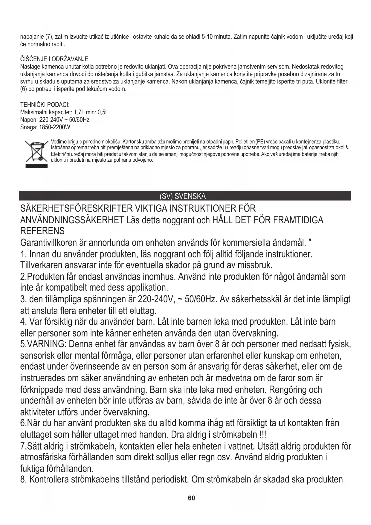 Observera: Endast under denna procedur är funktionen för att hålla värmen aktiv. När du har tagit bort vattenkokaren från basen, kommer inställningarna för att hålla varma funktioner att återställas. Kalkavlagringar inuti grytan bör avlägsnas regelbundet. Denna åtgärd omfattas inte av garantiservice. Brist på regelbunden avkalkning leder till skador på vattenkokaren och förlust av garanti. För avkalkning, använd preparat som är särskilt utformade för detta ändamål i enlighet med instruktionerna för avkalkningsmedlet. Efter avkalkning, skölj vattenkokaren noggrant tre gånger. Ta bort filtret (6) vid behov för att skölja under rinnande vatten. TEKNISK DATA: Spänning: 220-240V ~ 50/60Hz SKYDDSANORDNINGAR Effekt: 1850-2200W Enheten är utrustad med en automatisk säkring mot överhettning, säkringen går ut när vattenkokaren användes med otillräckligt vatten. Se alltid till att vattenmängden i apparaten är över miniminivån. Om säkringen slås på, stäng av vattenkokaren genom att trycka på strömbrytaren (7), ta sedan ut kontakten ur vägguttaget och låt vattenkokaren svalna i 5-10 minuter. Fyll sedan vattenkokaren med vatten och slå på enheten som fungerar normalt. Max kapacitet: 1,7L min: 0,5L AVANCERAD DRIFT:
